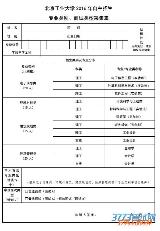 (1)《北京工业大学2016年自主招生专业类别和面试类型采集表》。