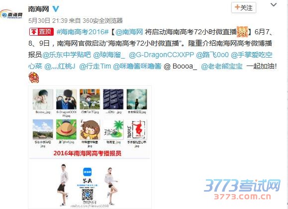 据了解,今年是南海网第五年招募高考播报员,每年招募10至20名播报员72小时不断线分享高考动态,利用播放员遍布全省的优势,为网友捕捉发回更多高考现场温馨动人的细节,让大家共同重温关于高考的故事和青春记忆。今年高考期间,“南海网高考播报员”团队的10名网友,将通过他们的手机随手写、随手拍,在南海网微博、客户端等平台,进行72小时微直播,与广大网友分享海口、三亚、琼海、文昌、万宁、五指山、乐东等7个市县考点的现场动态。如果你有和高考有关的图文、视频想发布,请发给南海网微信公众号(hinews0898),或发微博(新浪微博|腾讯微博)并@南海网,和我们一起聊聊高考的那些事。