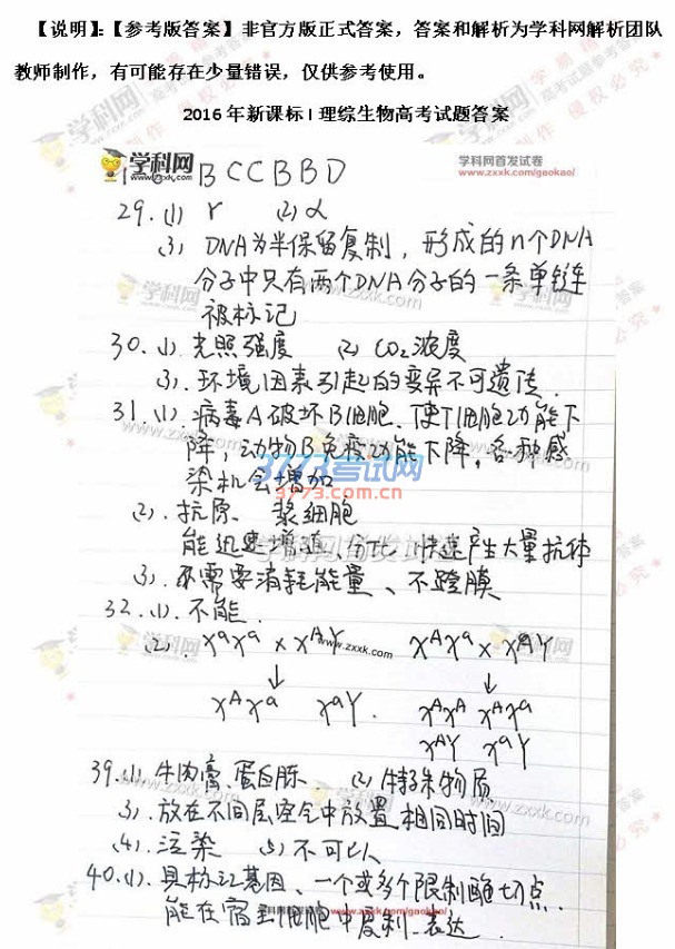 2016年新课标1理科综合高考试题及答案(图片)