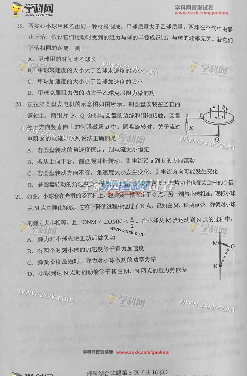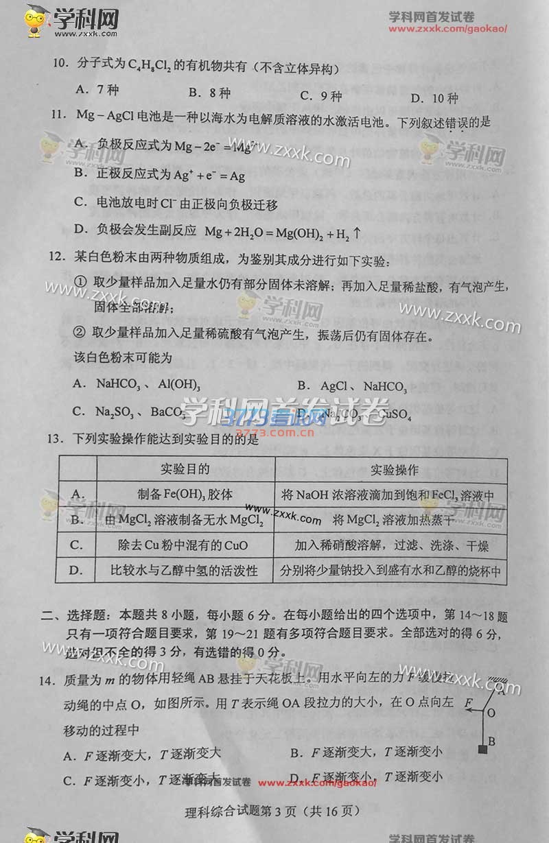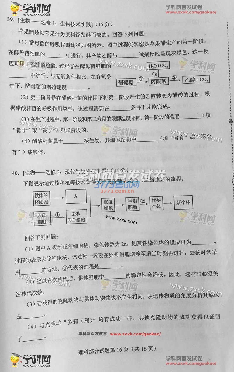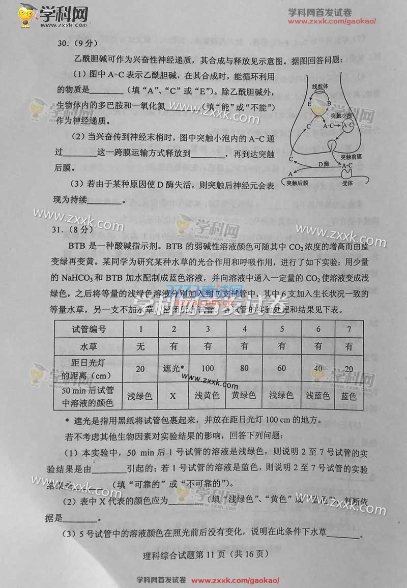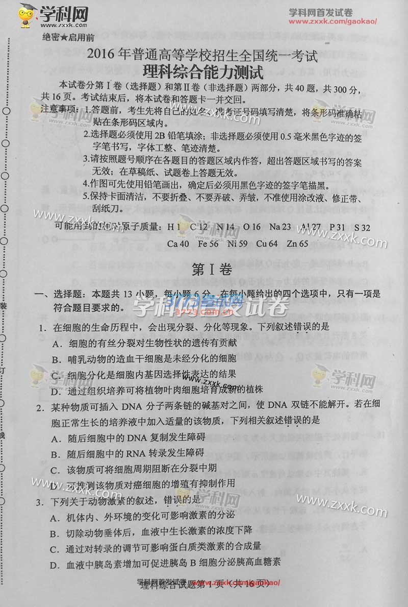 2016甘肃高考理综试题及答案(试题发布)