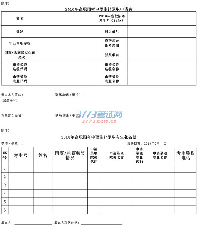 附件:1.2016年高职招考中职生补录取申请表
