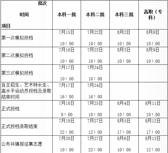 1.提前批次文史、理工类:本科7月5日—10日17∶00,专科7月11日—12日17∶00。体育、艺术类:本科7月5日—12日,专科7月13日—29日。高职单招与本科一批同时开始录取。