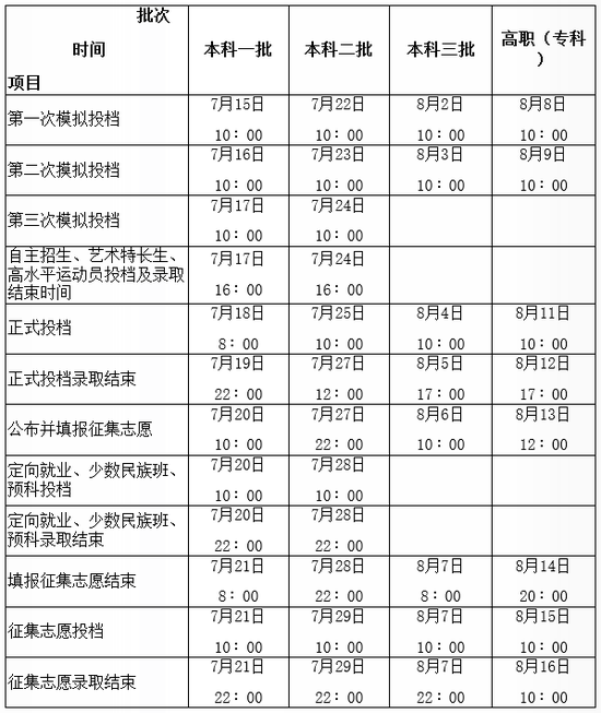 3、本科一批、本科二批、本科三批、高职(专科)日程如下表: