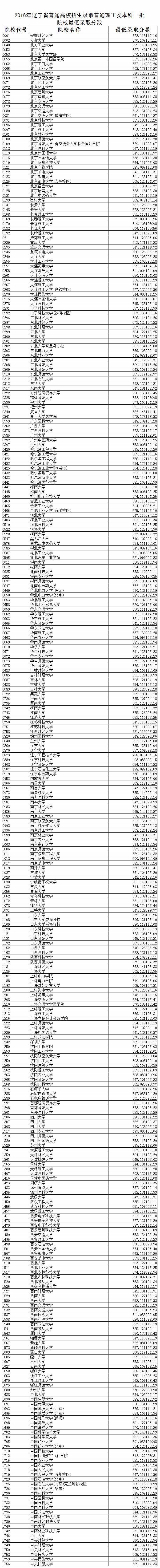 2016年辽宁高考理工类本科一批院校最低录取分数