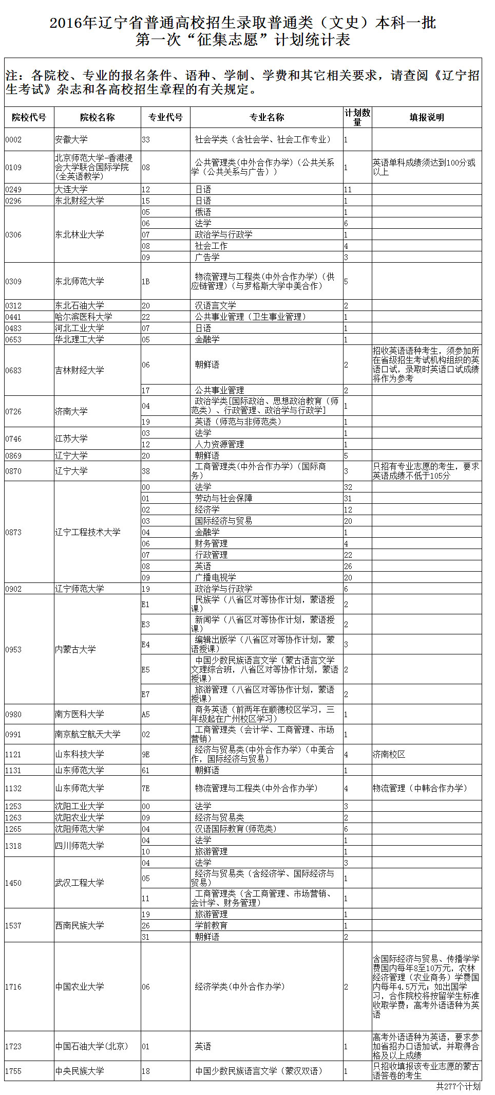 2016年辽宁高考本科一批第一次征集志愿计划(文史)