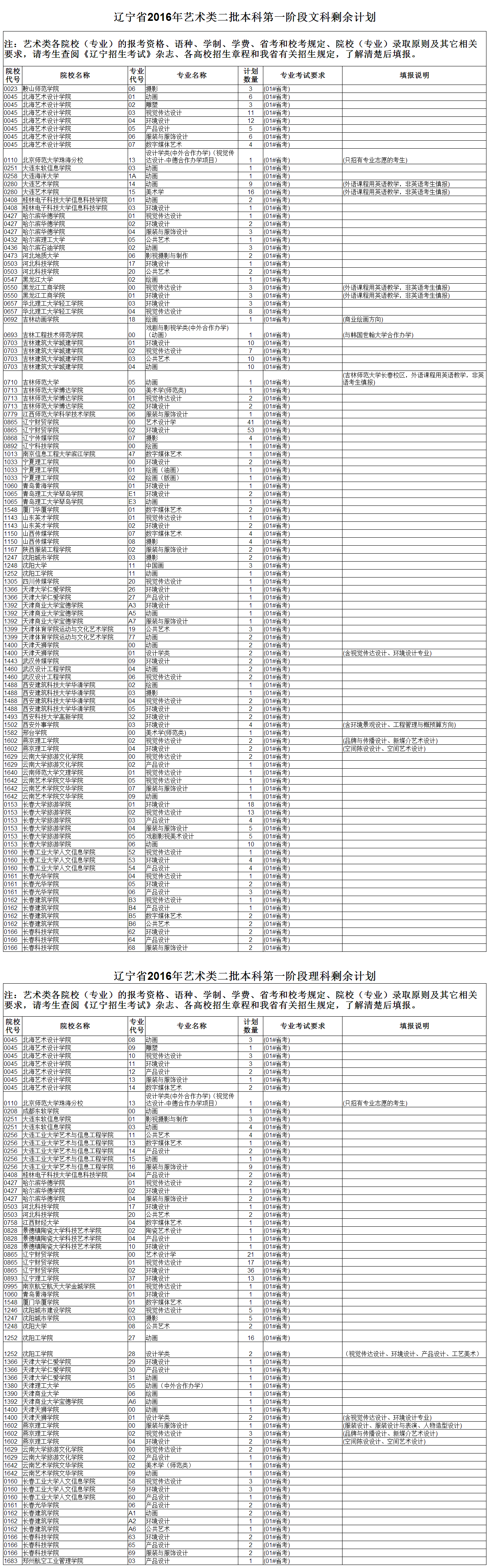 2016年辽宁本科二批第一阶段录取院校剩余计划统计表