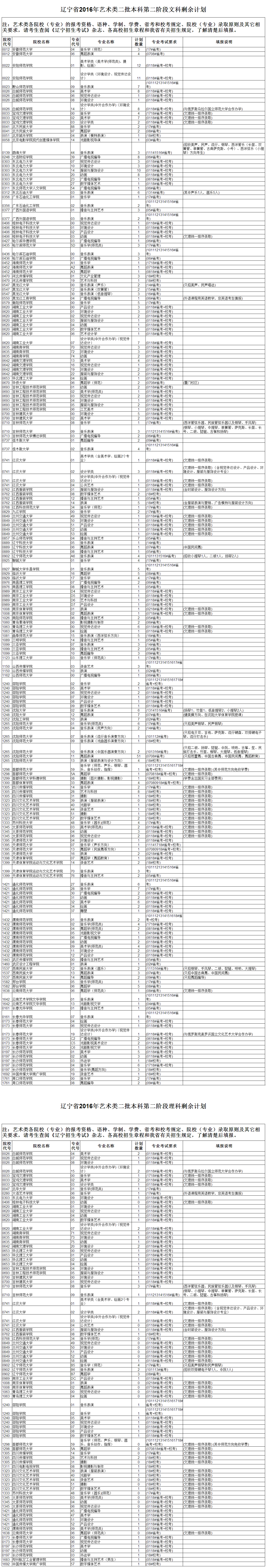 2016年辽宁省普通高校招生艺术类本科二批第二阶段录取院校剩余计划统计表