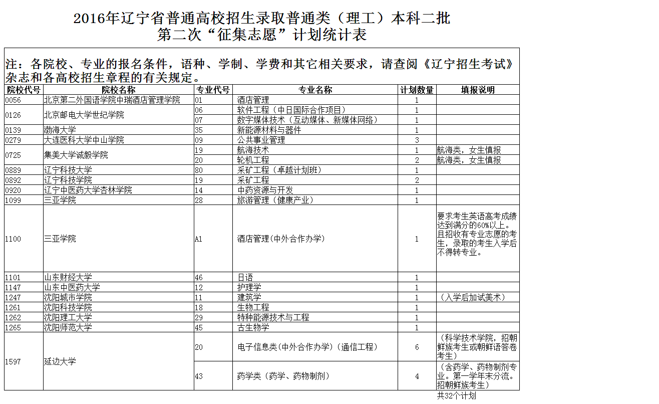 2016年辽宁高考(理工)本科二批第二次征集志愿计划
