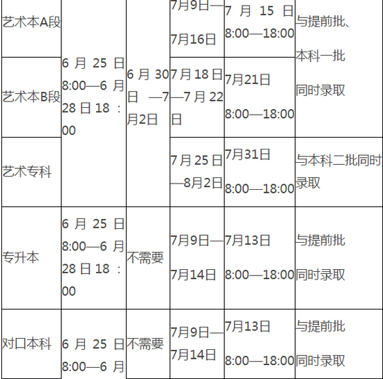 6。 本科一批、本科二批和高职高专批均实行平行志愿,其中本科一批和高职高专批可填报1-6个高校志愿,本科二批可填报1-9个高校志愿。提前批(除艺术外)、国家专项计划本科批、地方专项计划本科批和专科提前批第一志愿设1个高校志愿,第二志愿设4个高校平行志愿。艺术类志愿分本、专科两个批次,其中本科批次分A、B两段,每段可按顺序2个高校志愿,专科批次可按顺序填报2个高校志愿。艺术类各批各段分别划定专业和文化录取控制分数线。