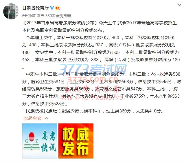 【2017年甘肃省高考录取分数线公布】今天上午,甘肃省2017年普通高等学校招生本科及高职专科录取最低控制分数线公布。