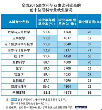 数据显示,十大理科热门专业中,信息与计算科学表现突出,就业率(92.9%)、月收入(5137元)、就业满意度(71%)这三项指标均居理科热门专业第一。