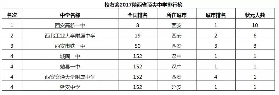 西安高新一中、西北工业大学附属中学、西安市铁一中、城固一中、勉县一中、西安交通大学附属中学、延安中学名列2016陕西省顶尖中学排行榜前5强;