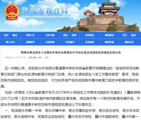 7月26日,邯郸市教育局通过官方网站发布了《邯郸市教育局关于部分外地民办普通高中在我市违规招生处理意见的公告》(以下简称“《公告》”)。