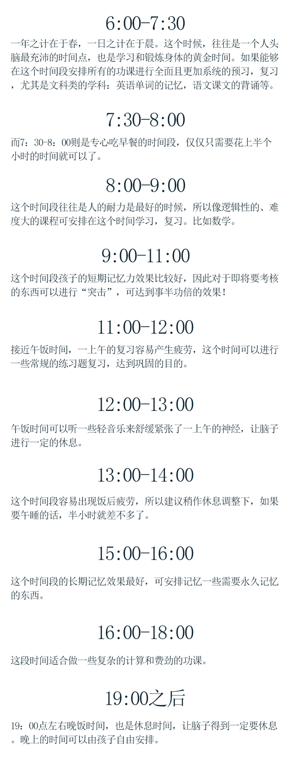 这个作息表大家可以进行适当的参考,但完全没有必要进行照搬,毕竟每个孩子的实际情况都不相同。家长可以和孩子共同研究,制定一个最适合孩子的学习方案。