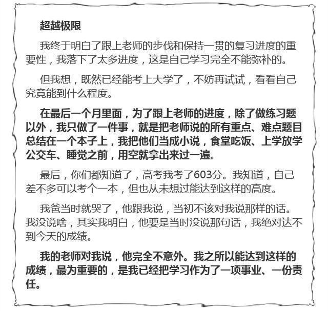 补充:短时间的按照计划执行不会有明显的成效,只有长时间的坚持,一点点积累才有可能完成逆袭。这位同学属于极其聪明的类型,万望同学们能够及时醒悟,提前改正自己的学习习惯,好好学习。