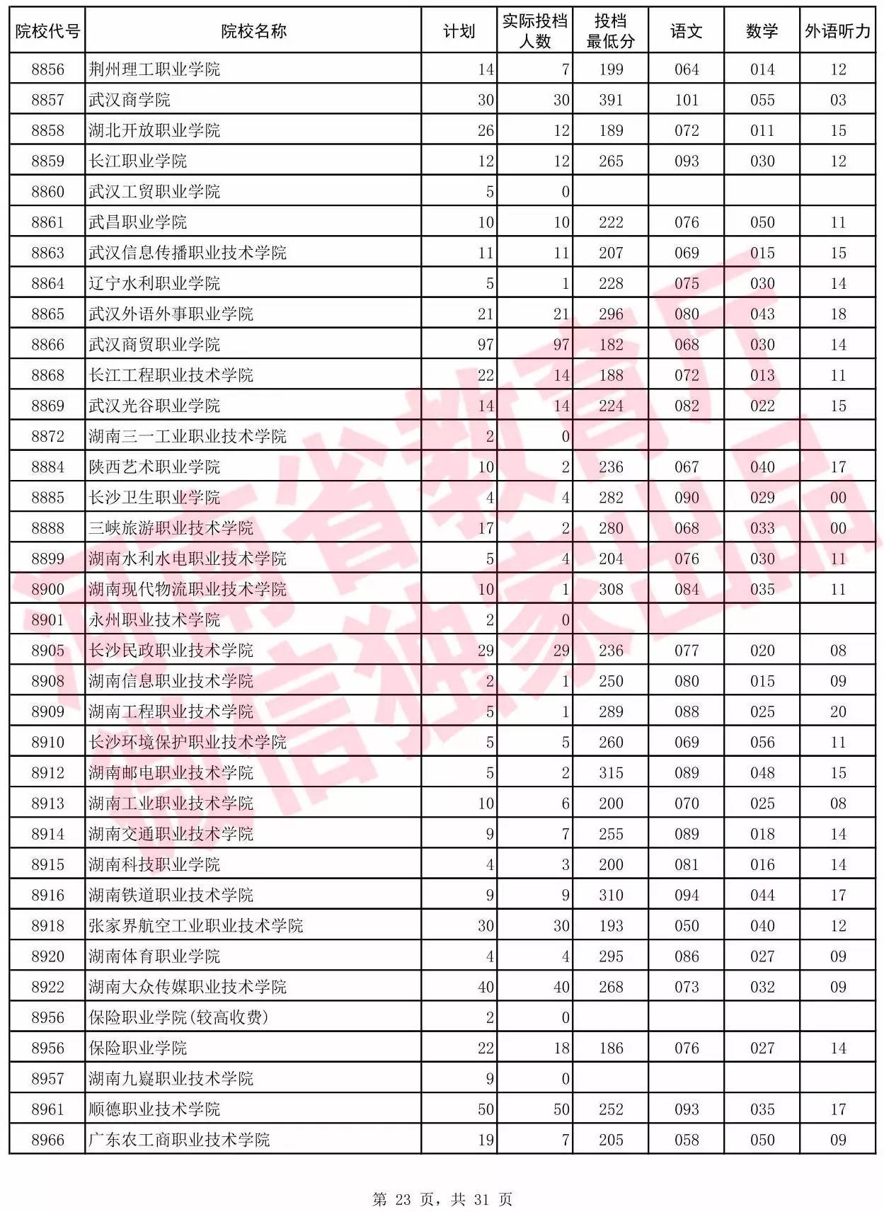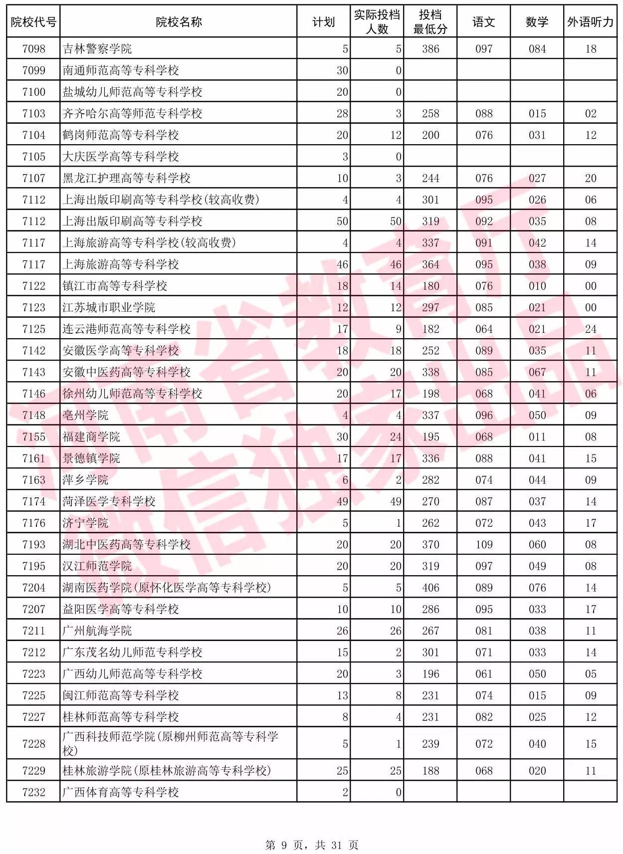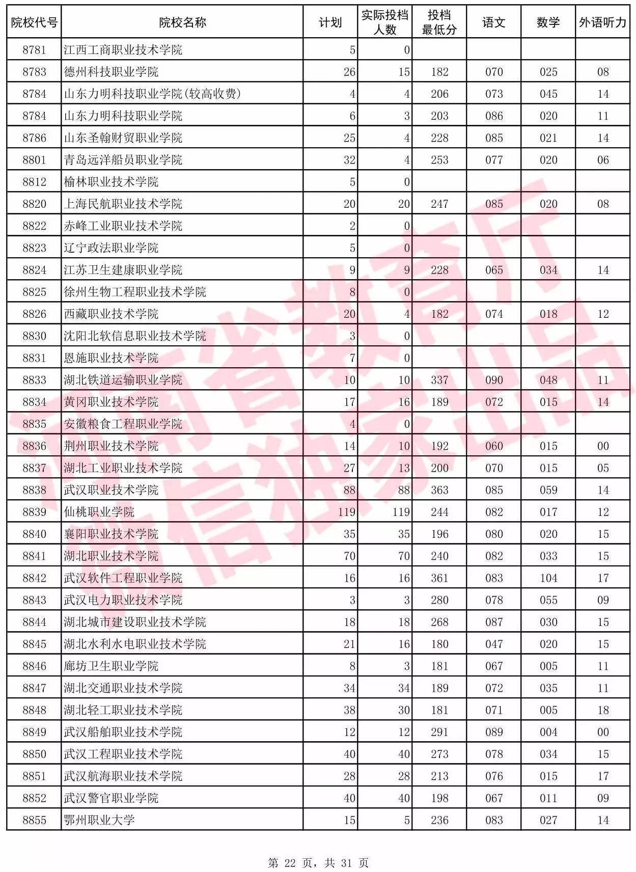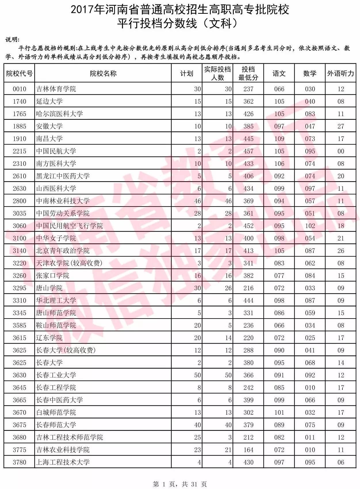 高职高专批院校平行投档分数线(文科)