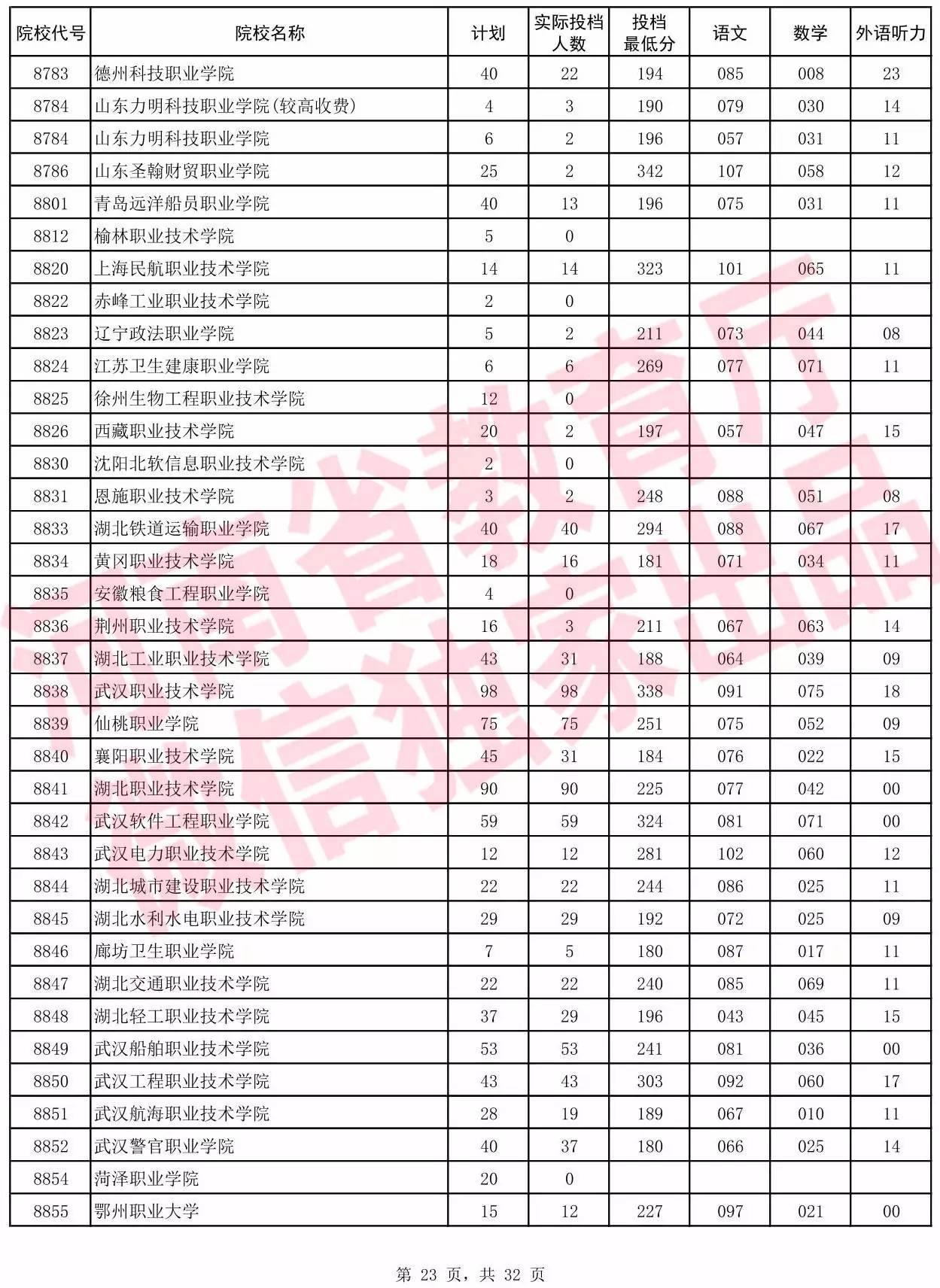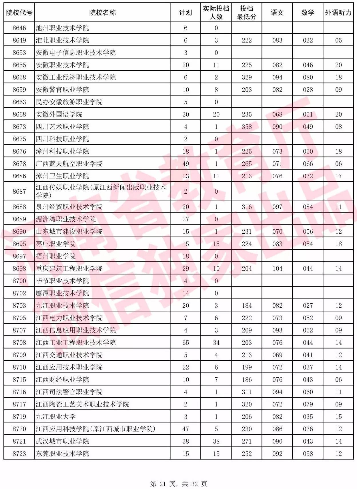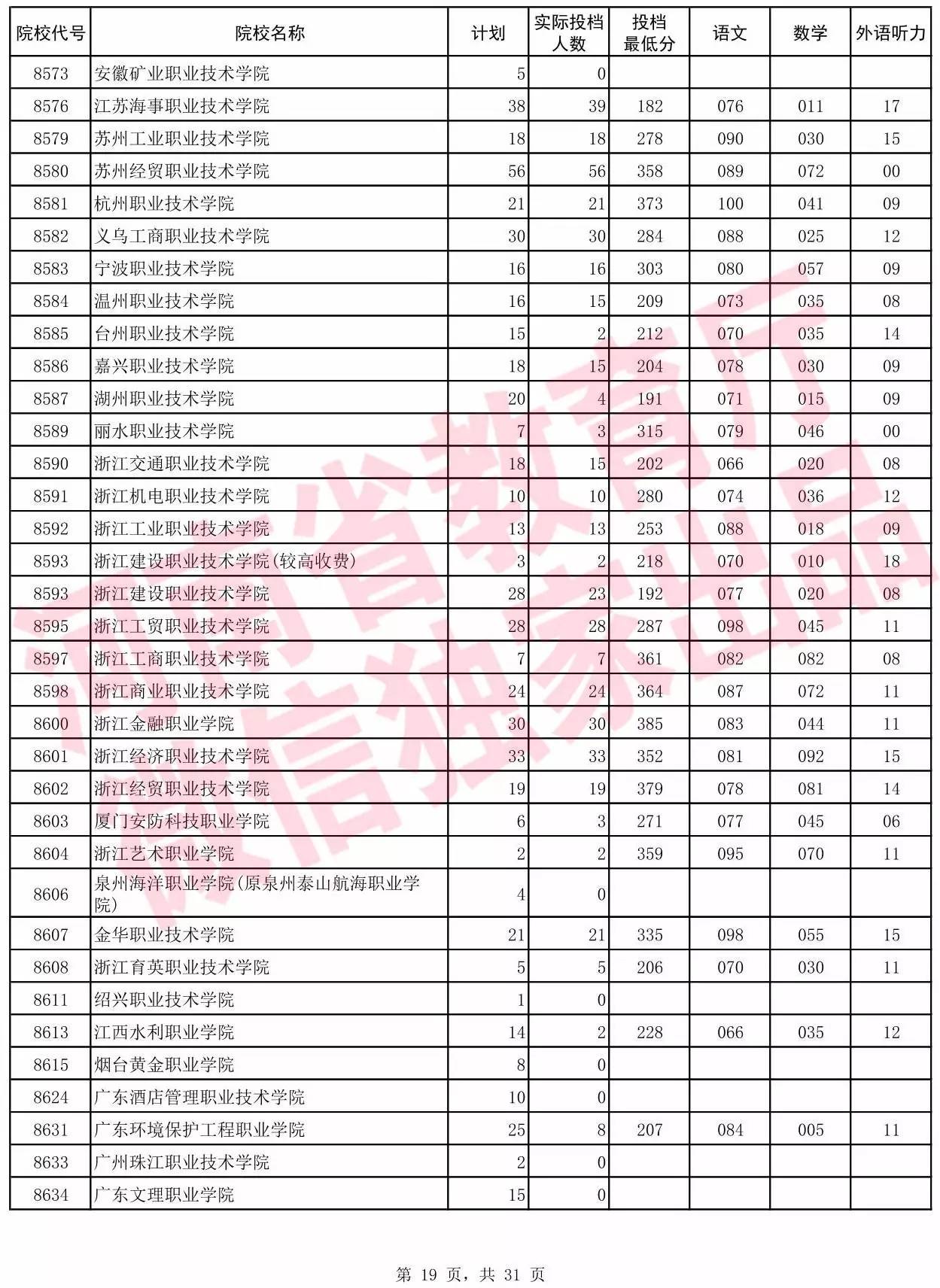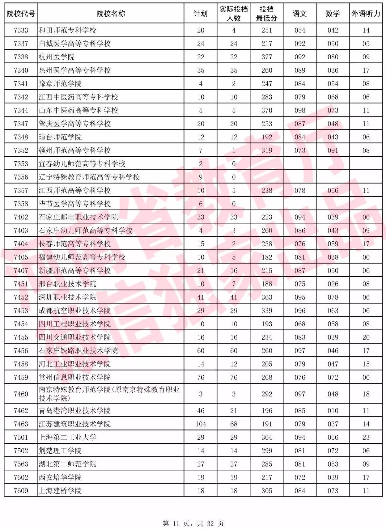 高职高专批院校平行投档分数线(文科)