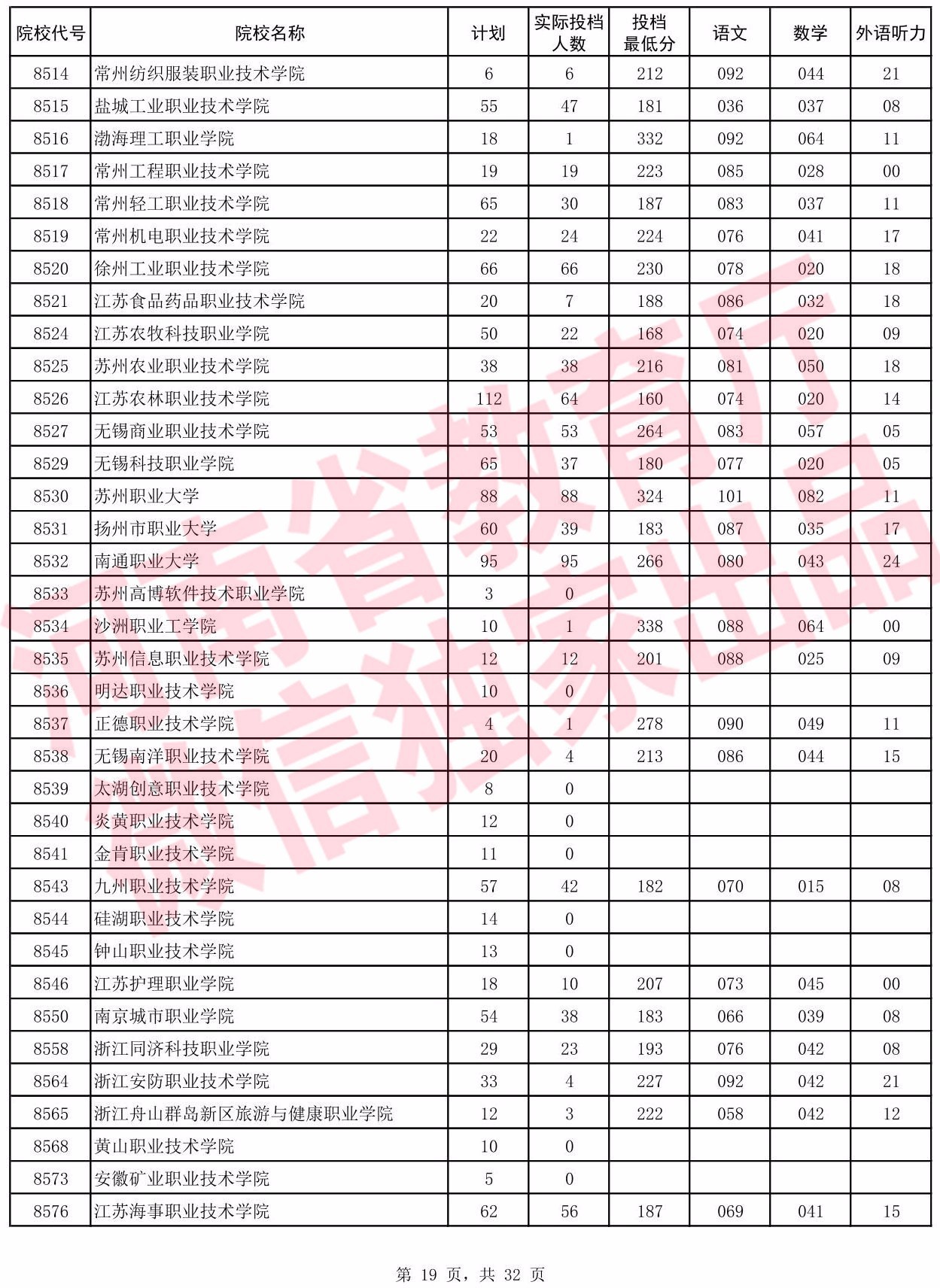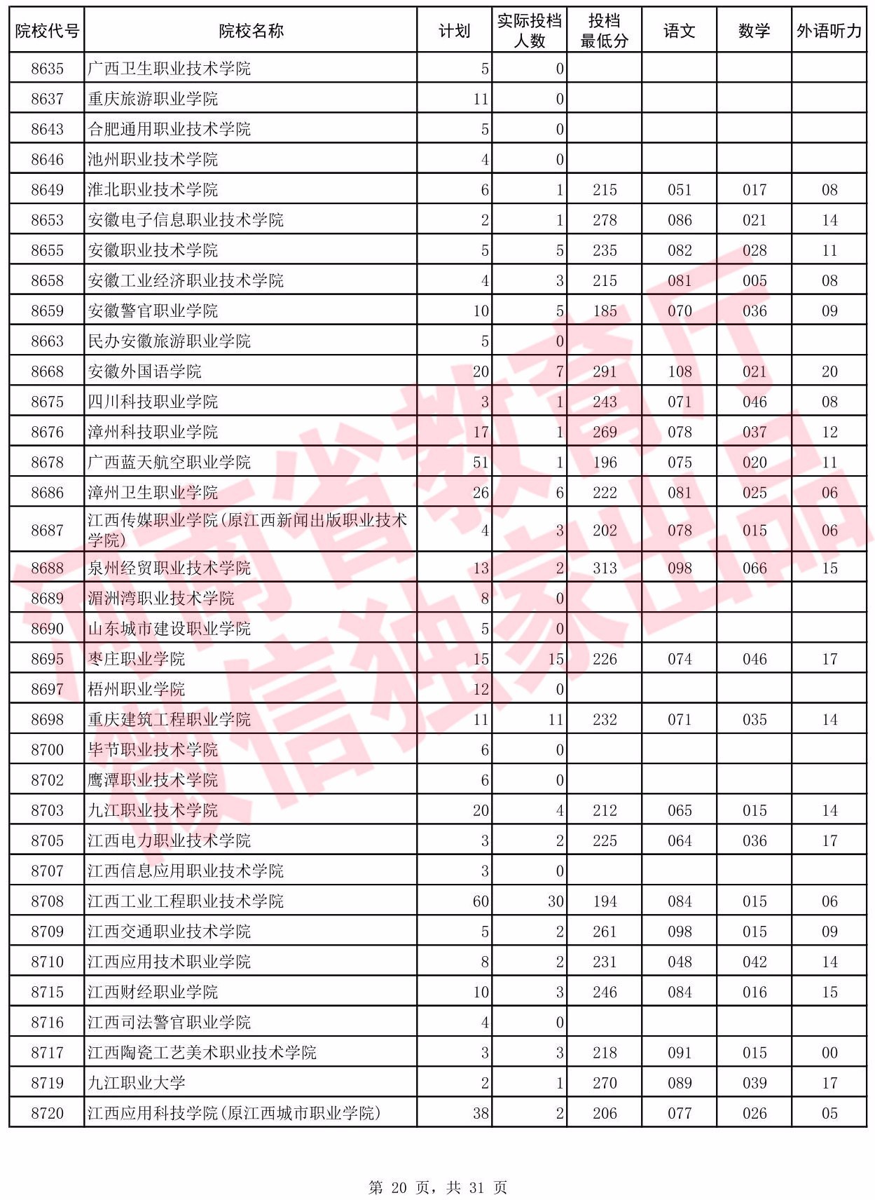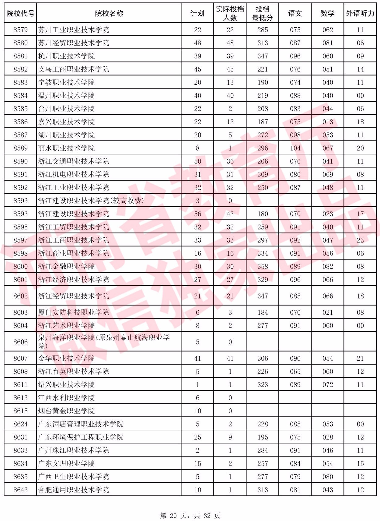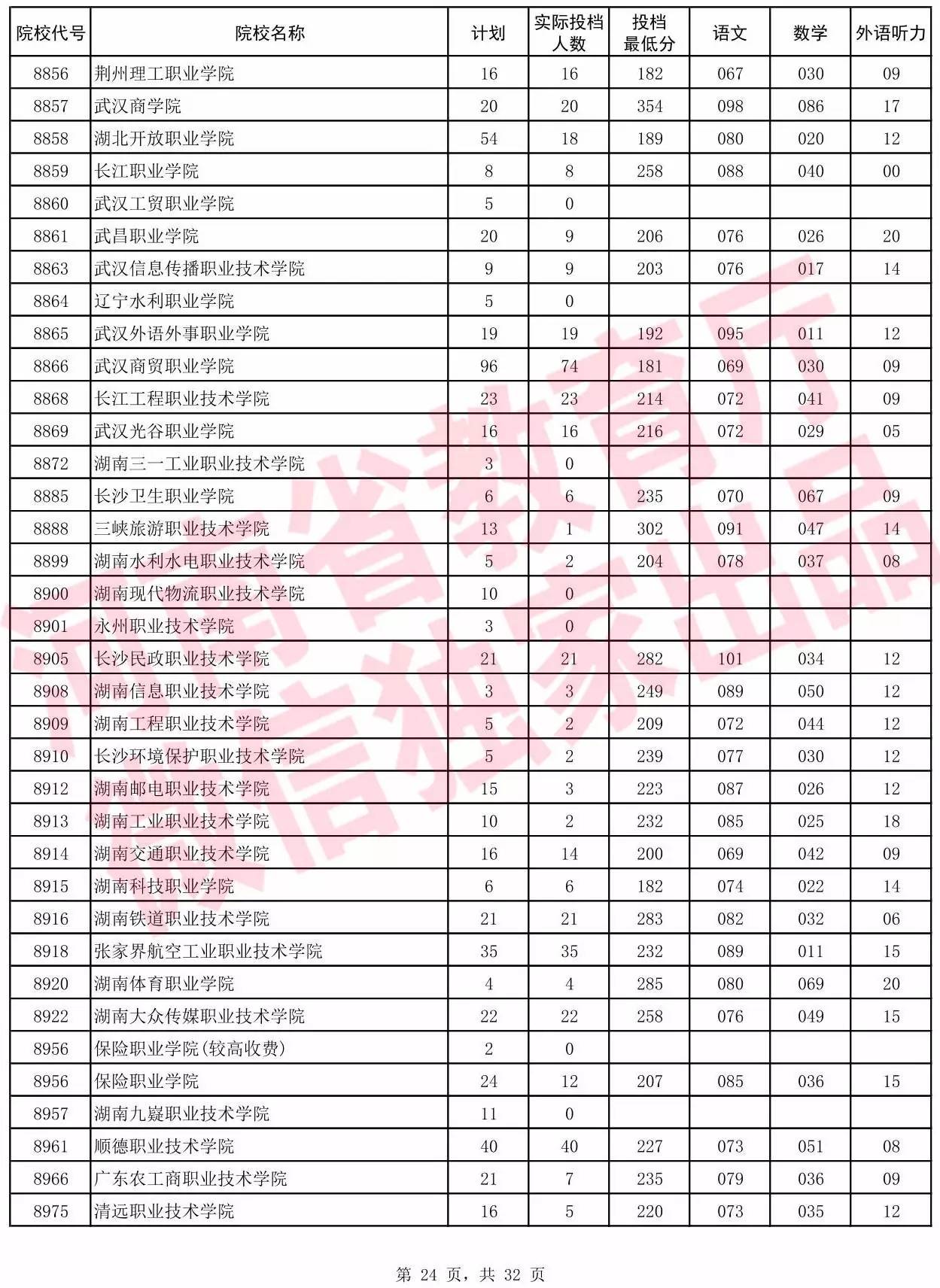 高职高专批院校平行投档分数线(文科)