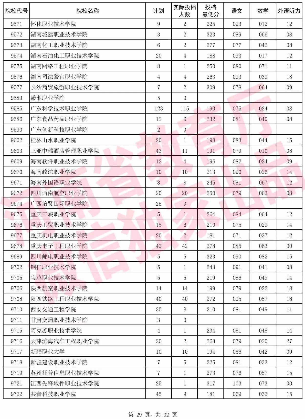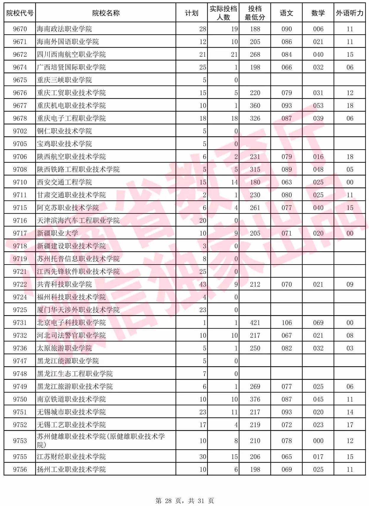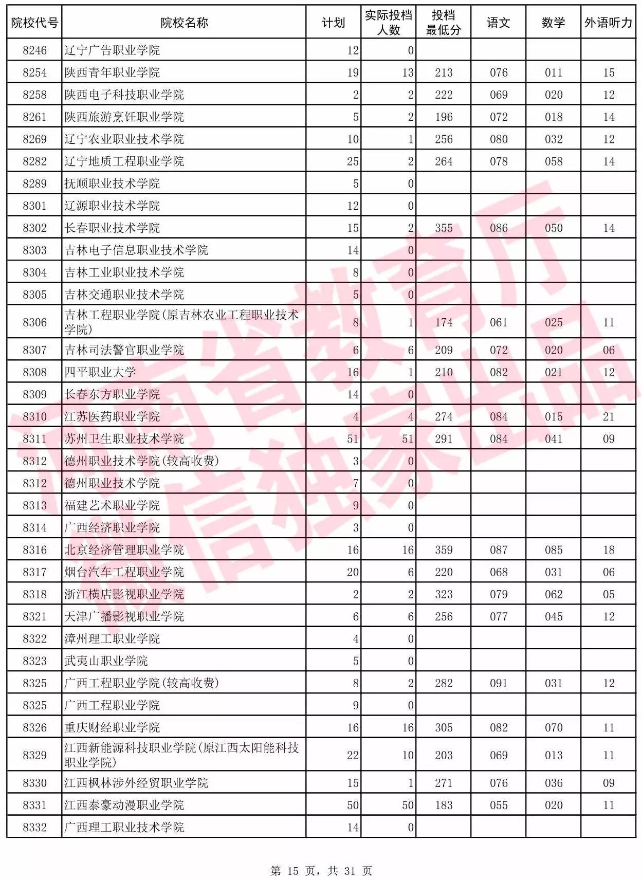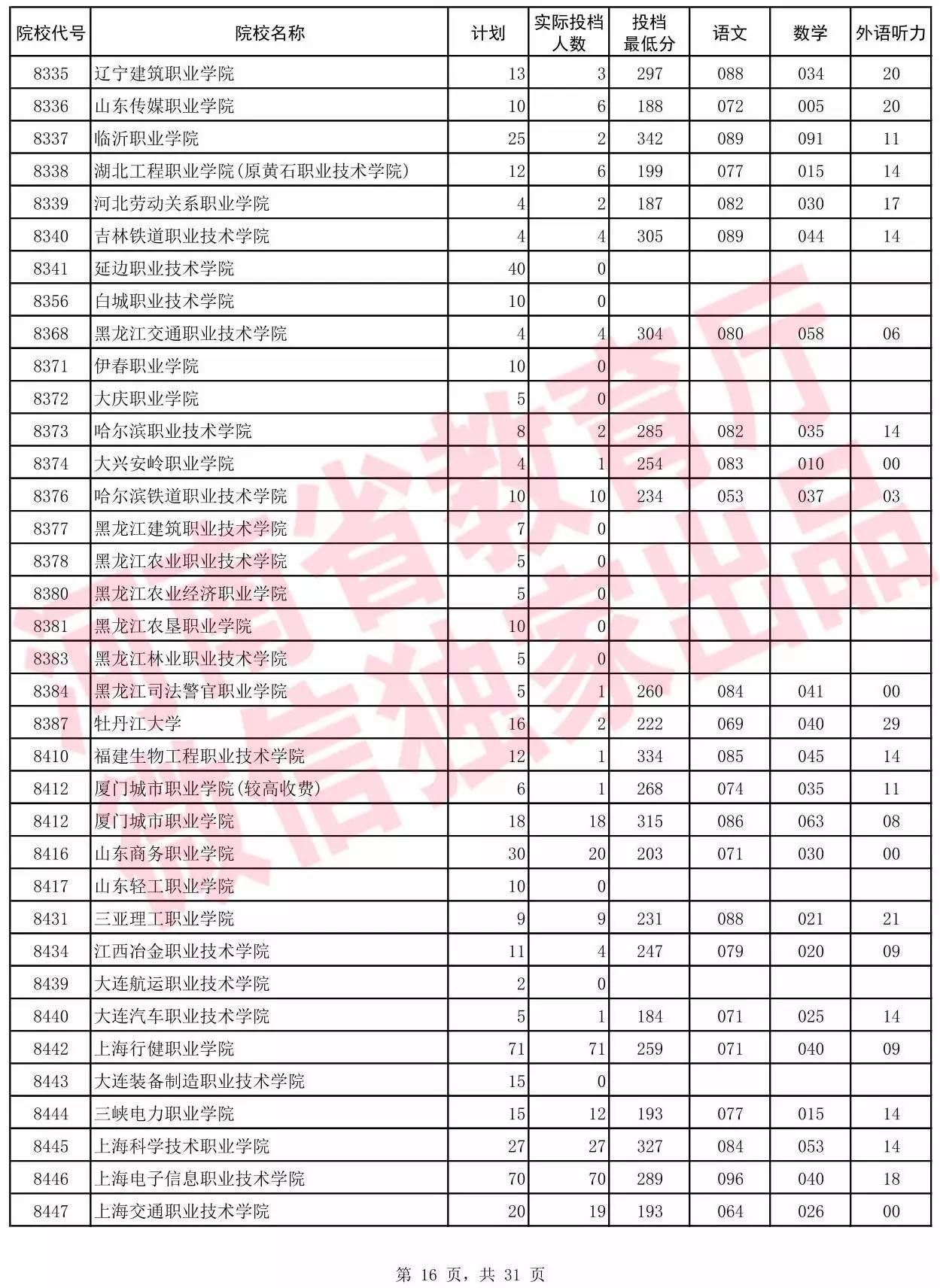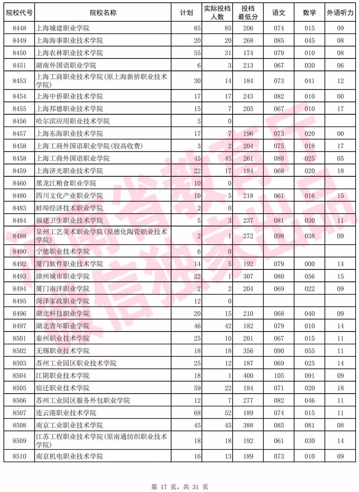 高职高专批院校平行投档分数线(理科)