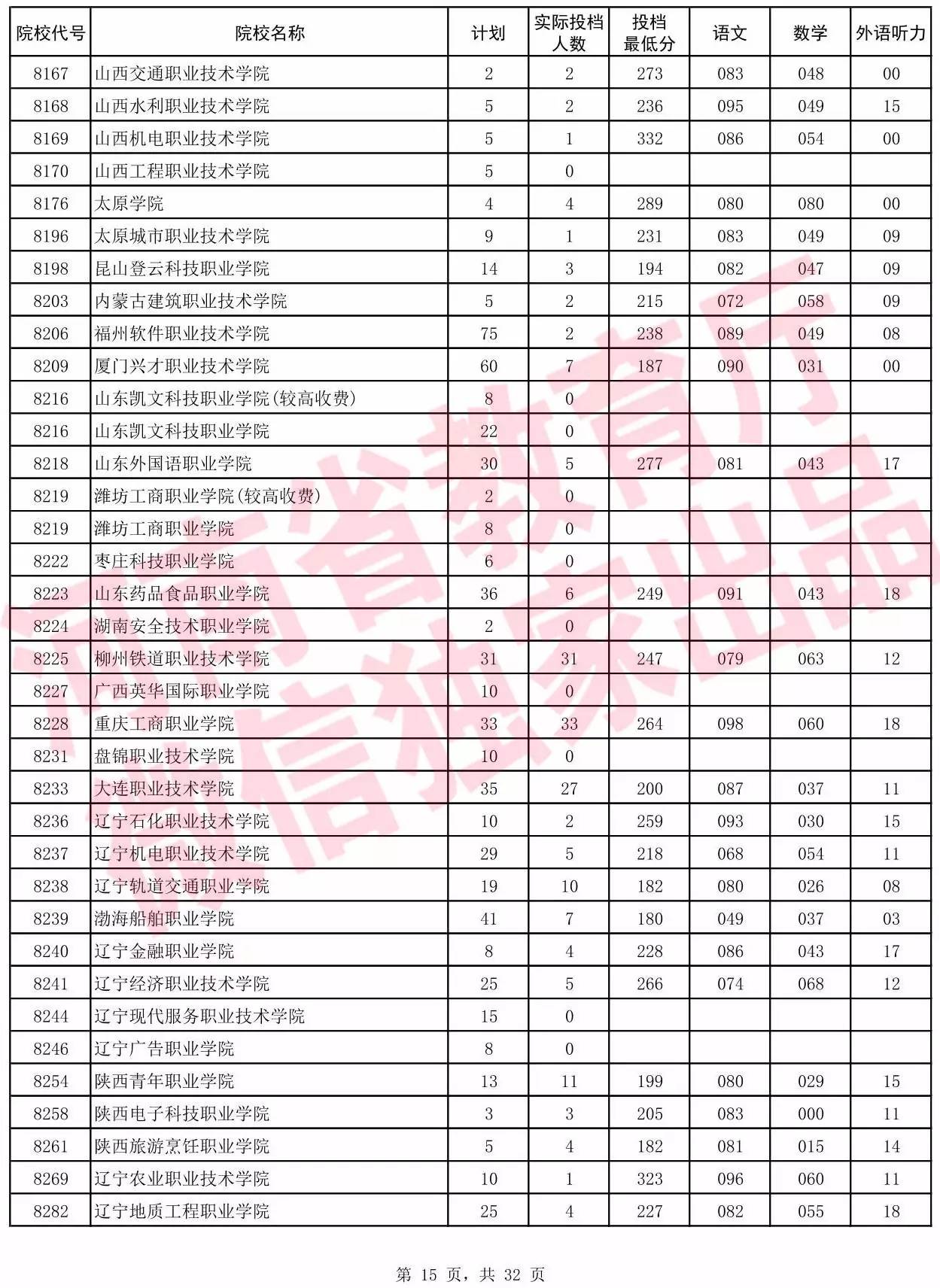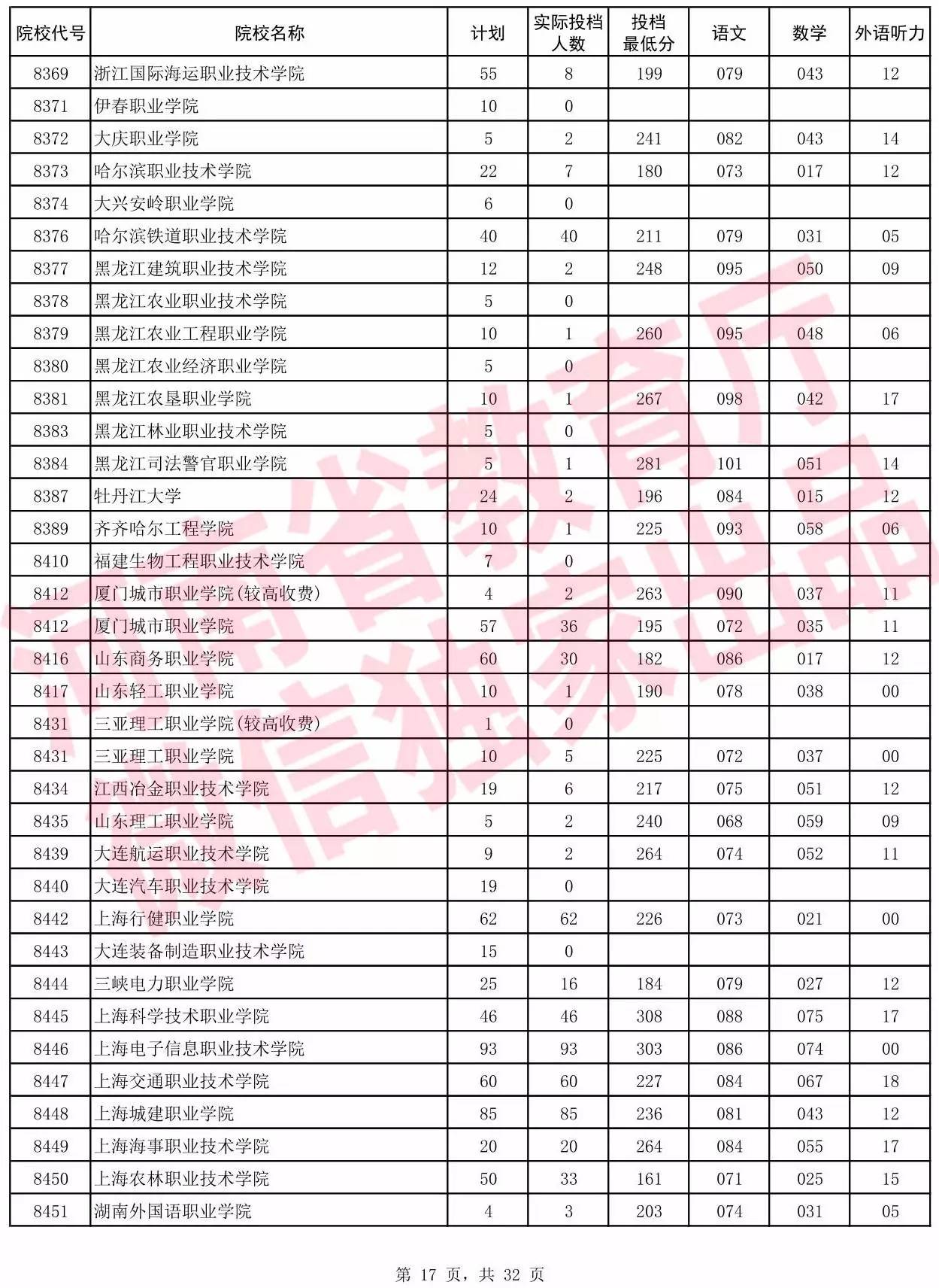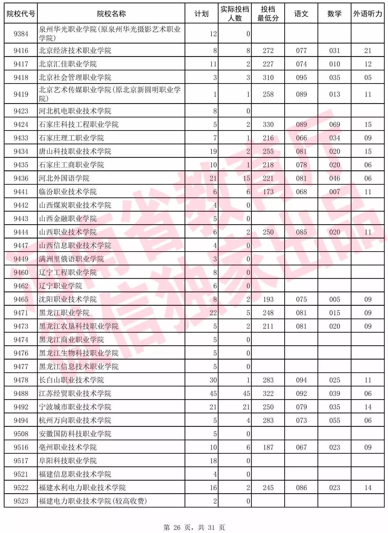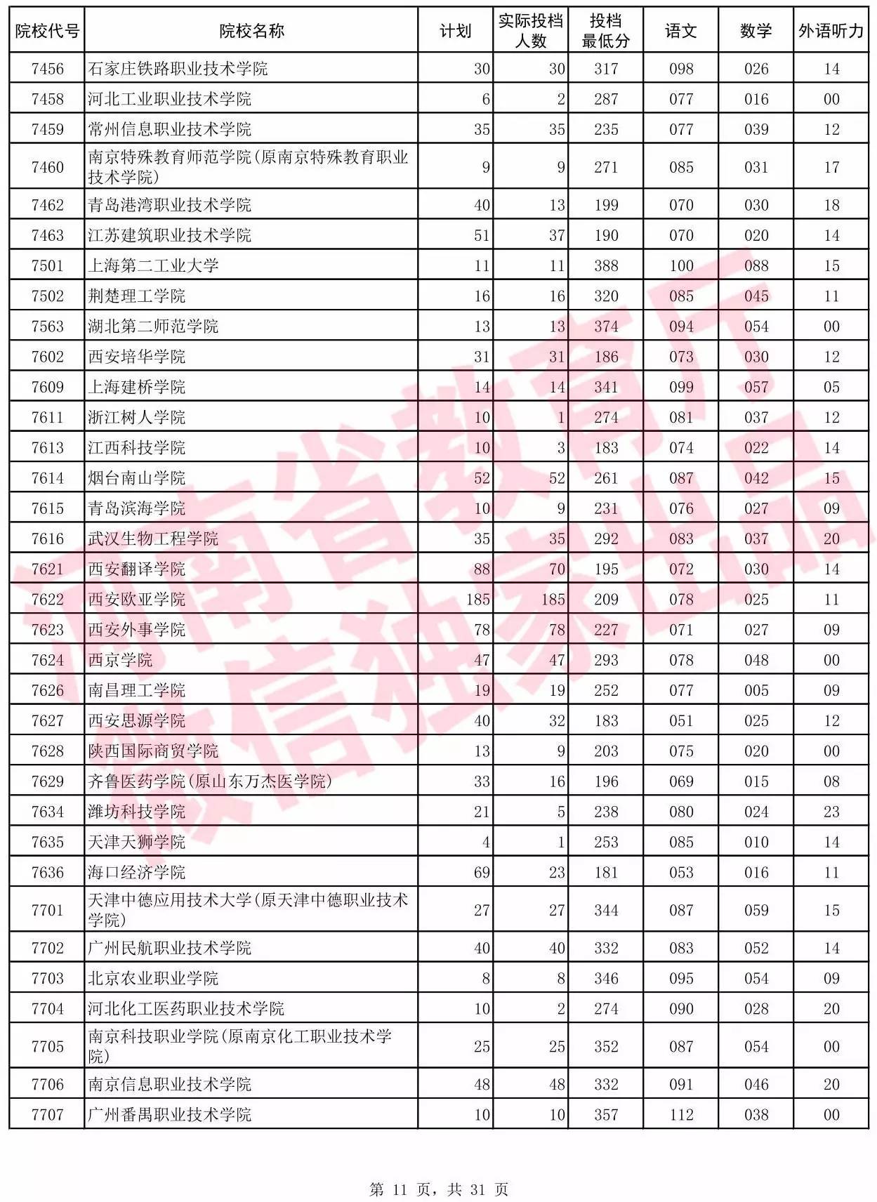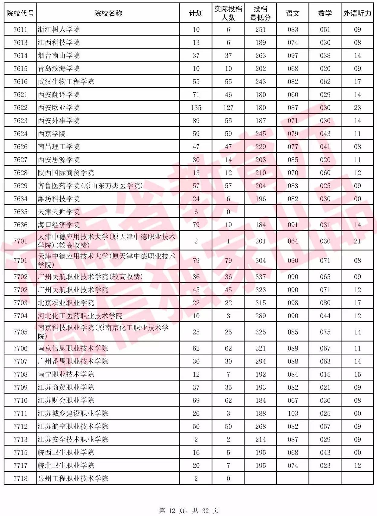 高职高专批院校平行投档分数线(理科)