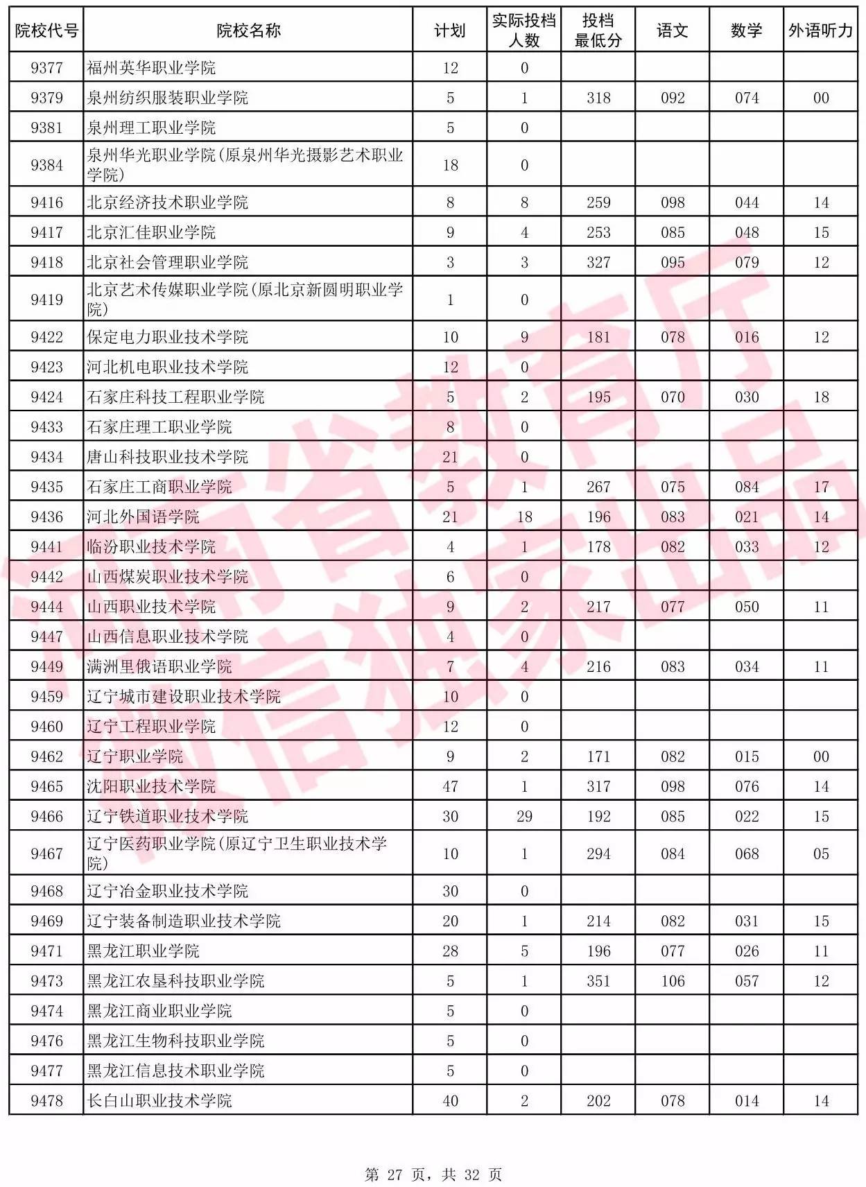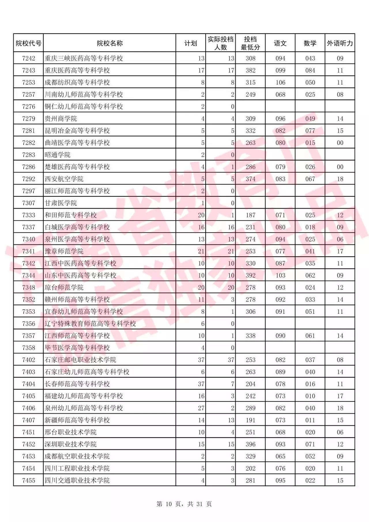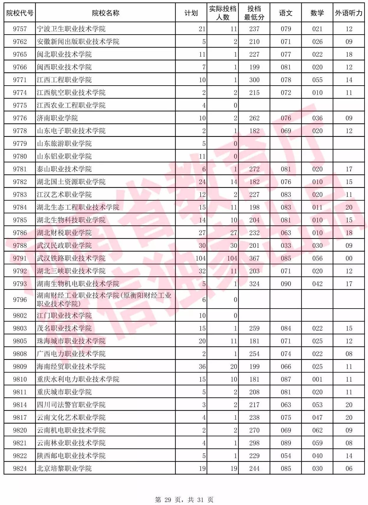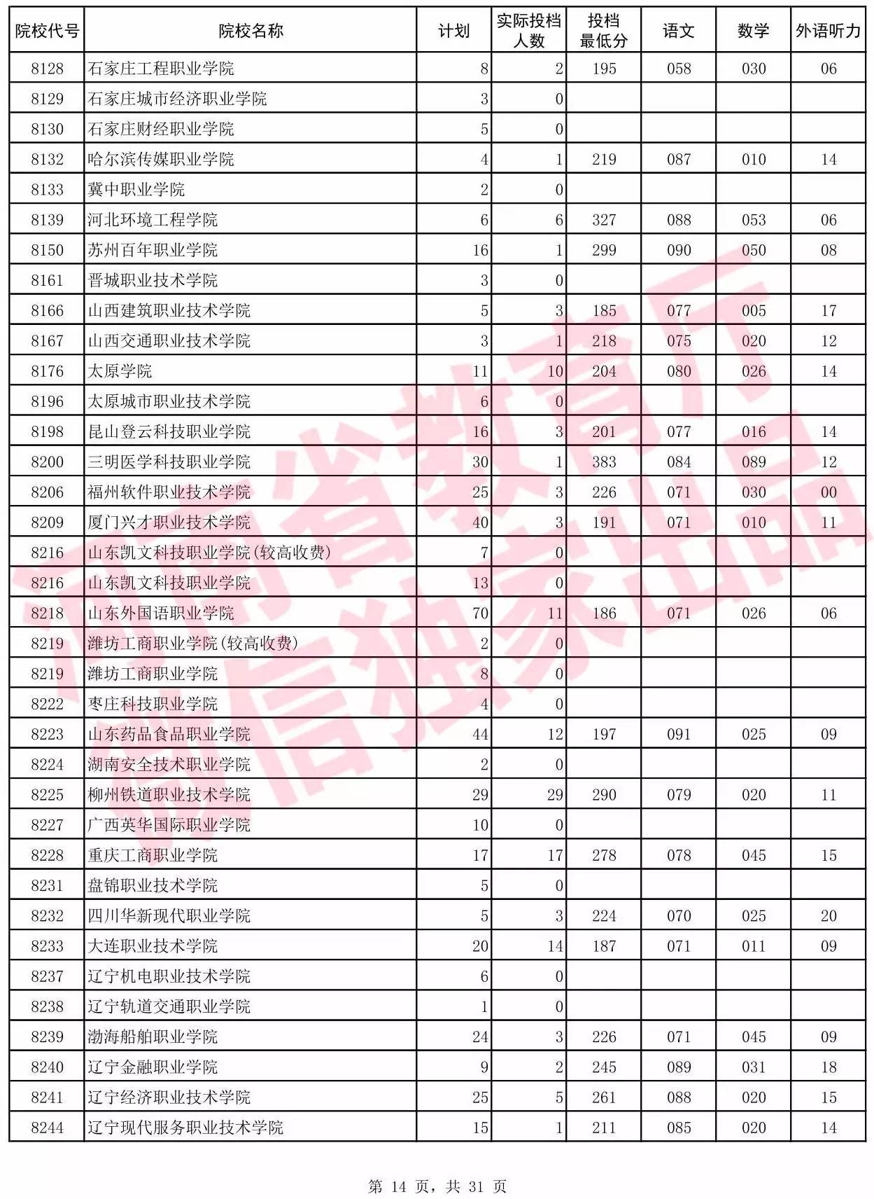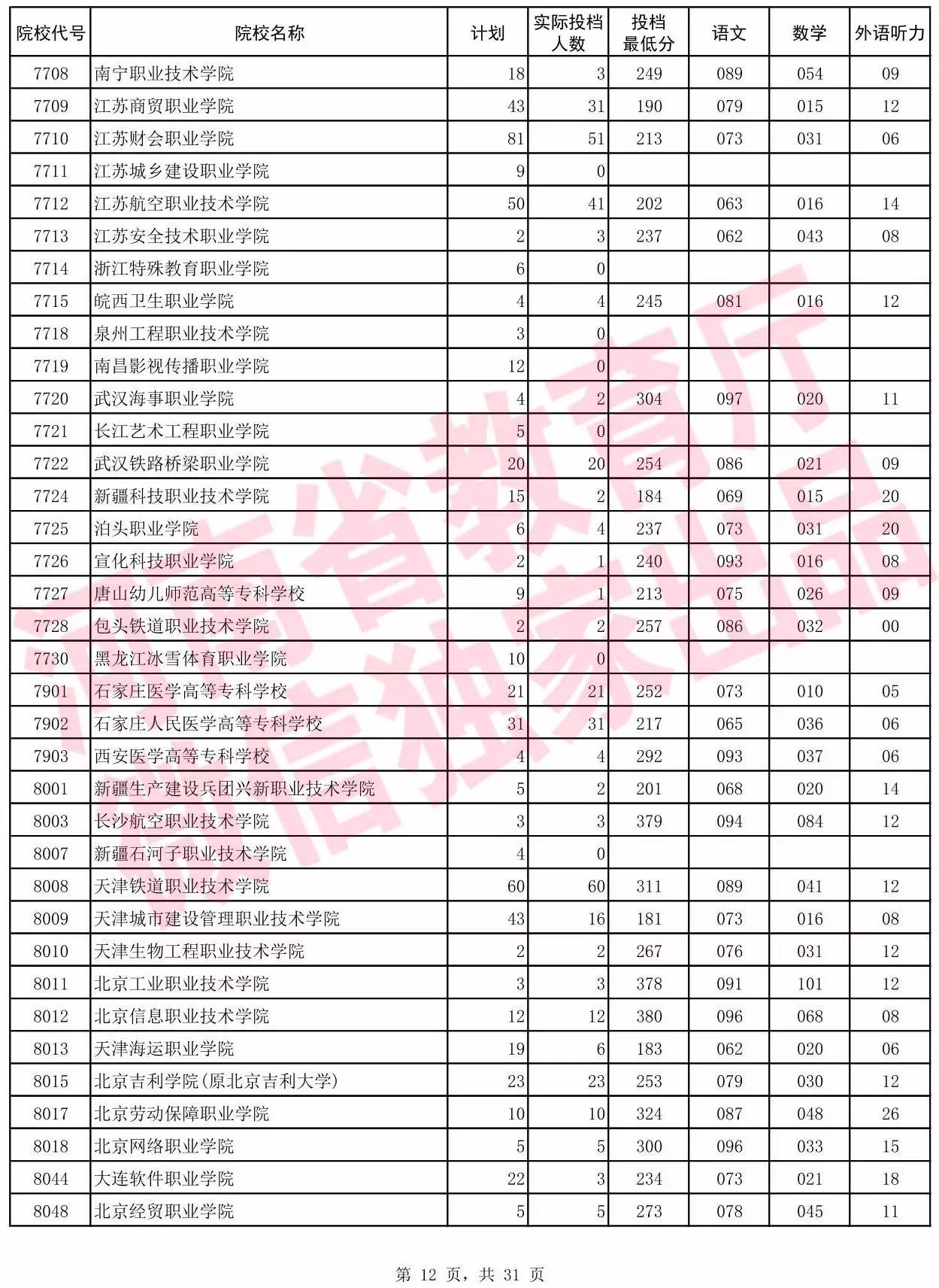 高职高专批院校平行投档分数线(理科)