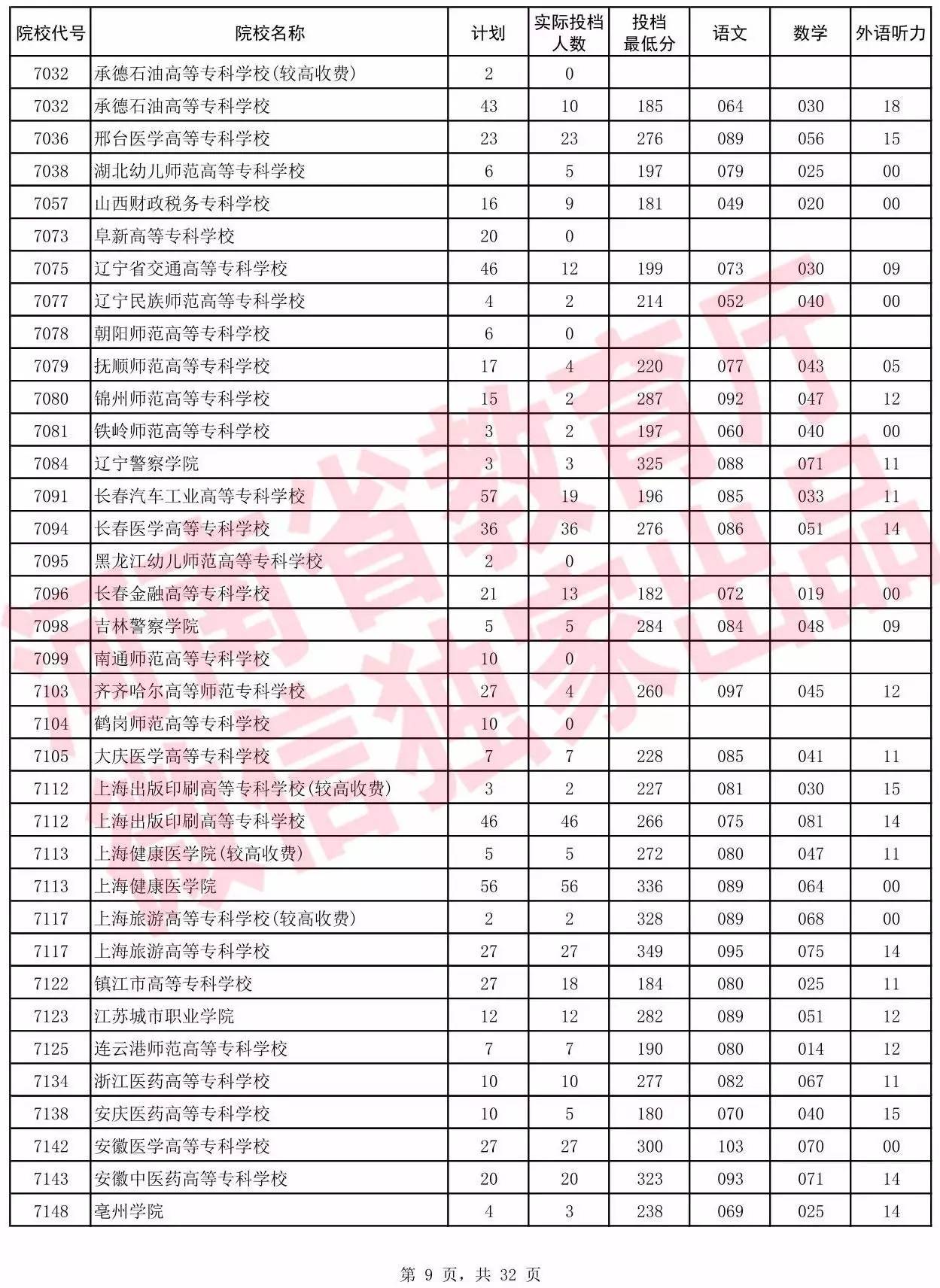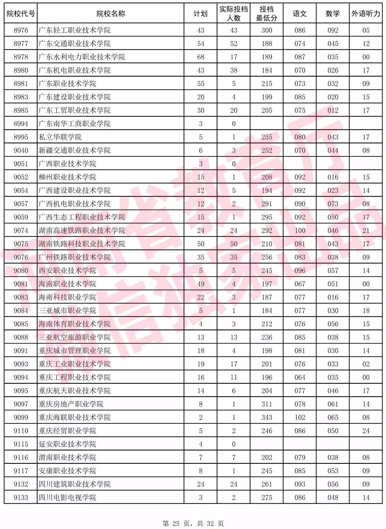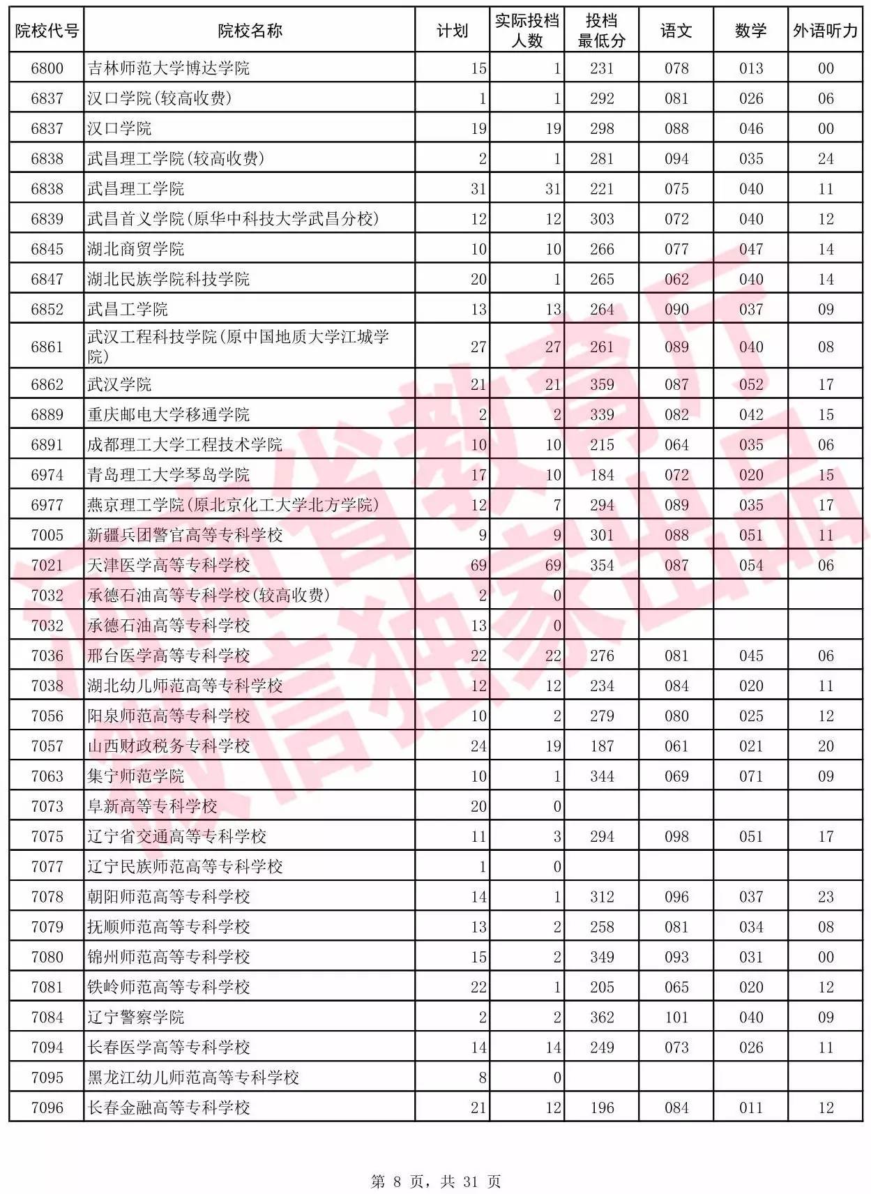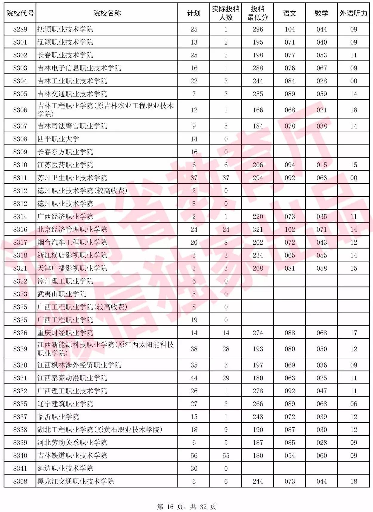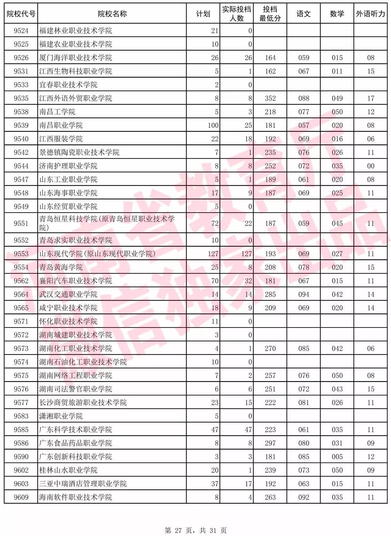 高职高专批院校平行投档分数线(理科)