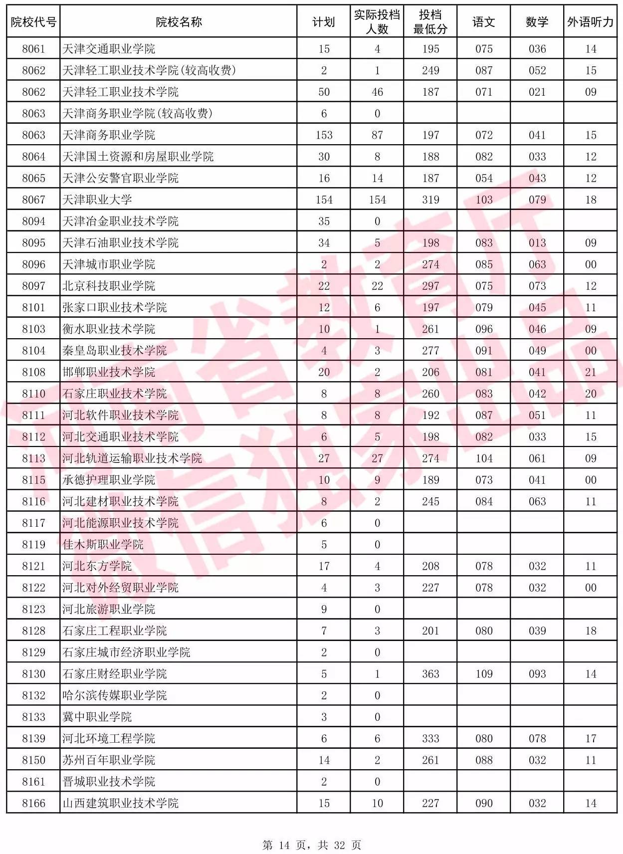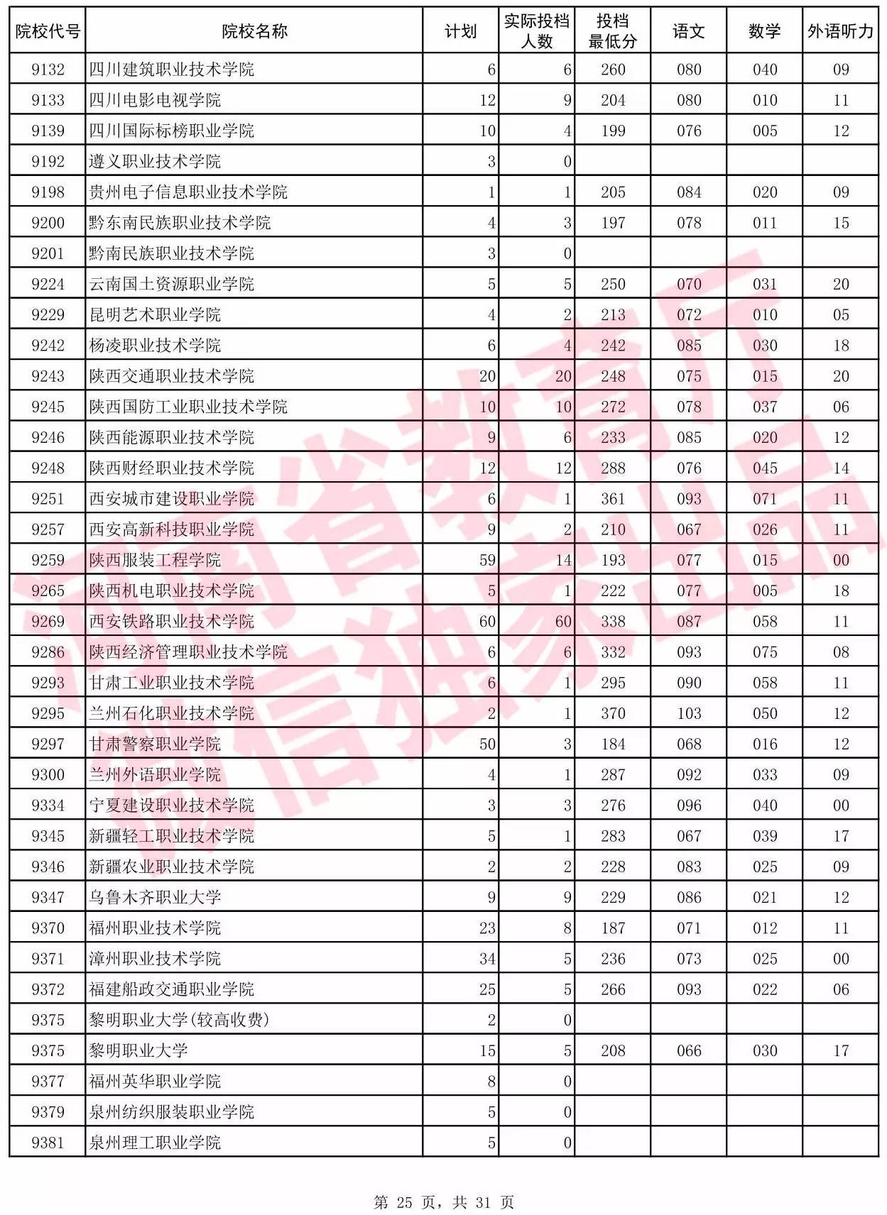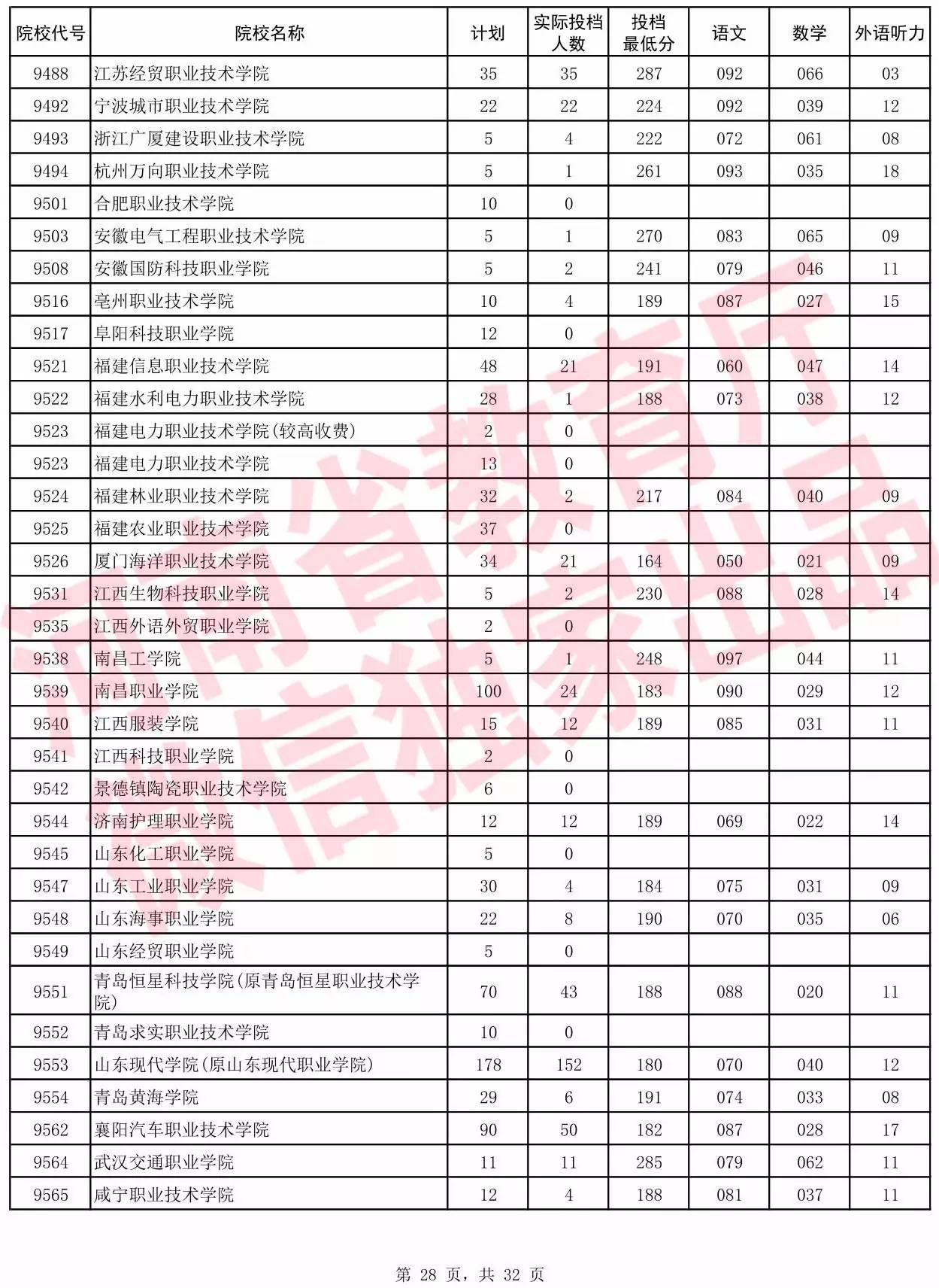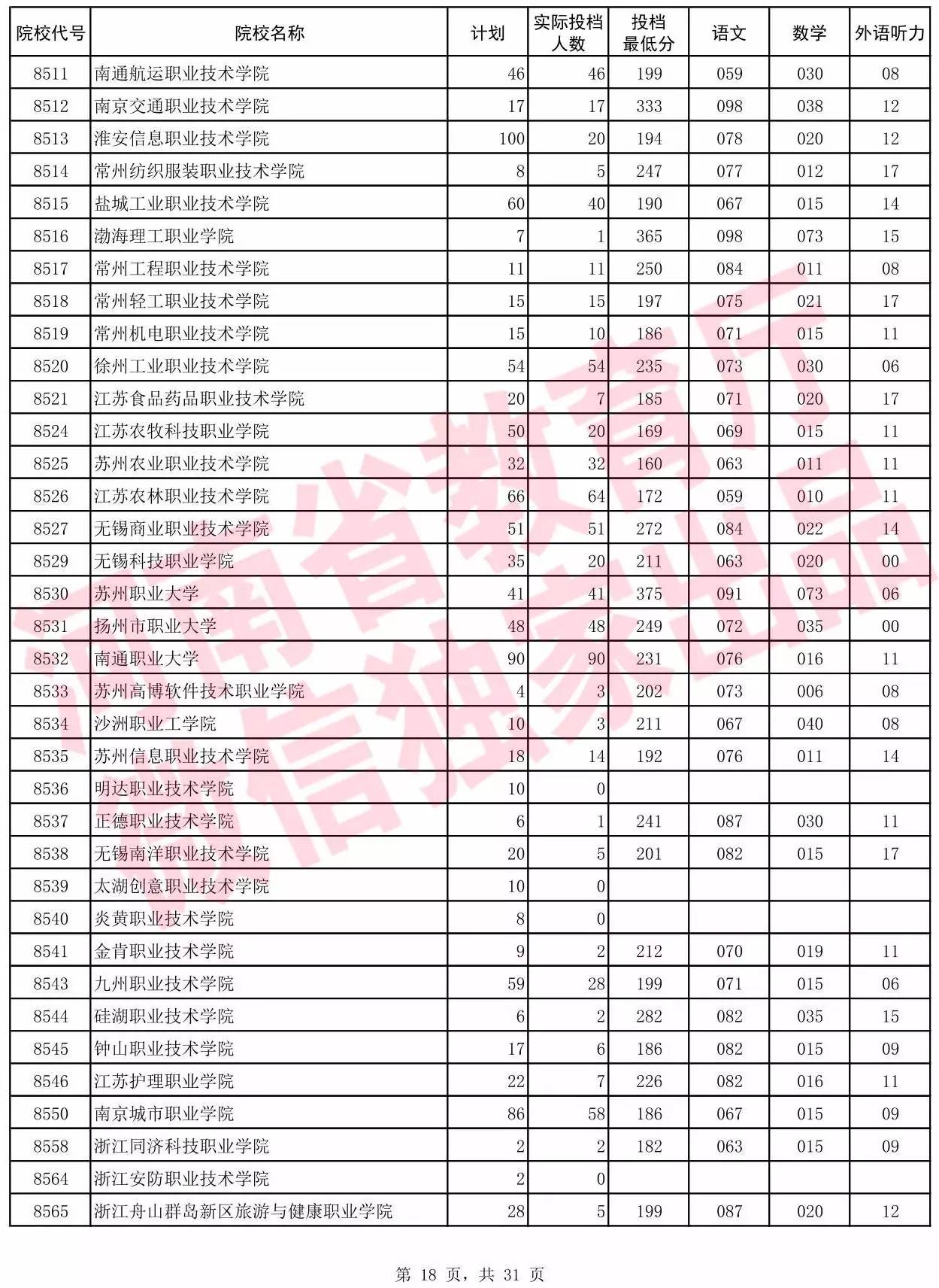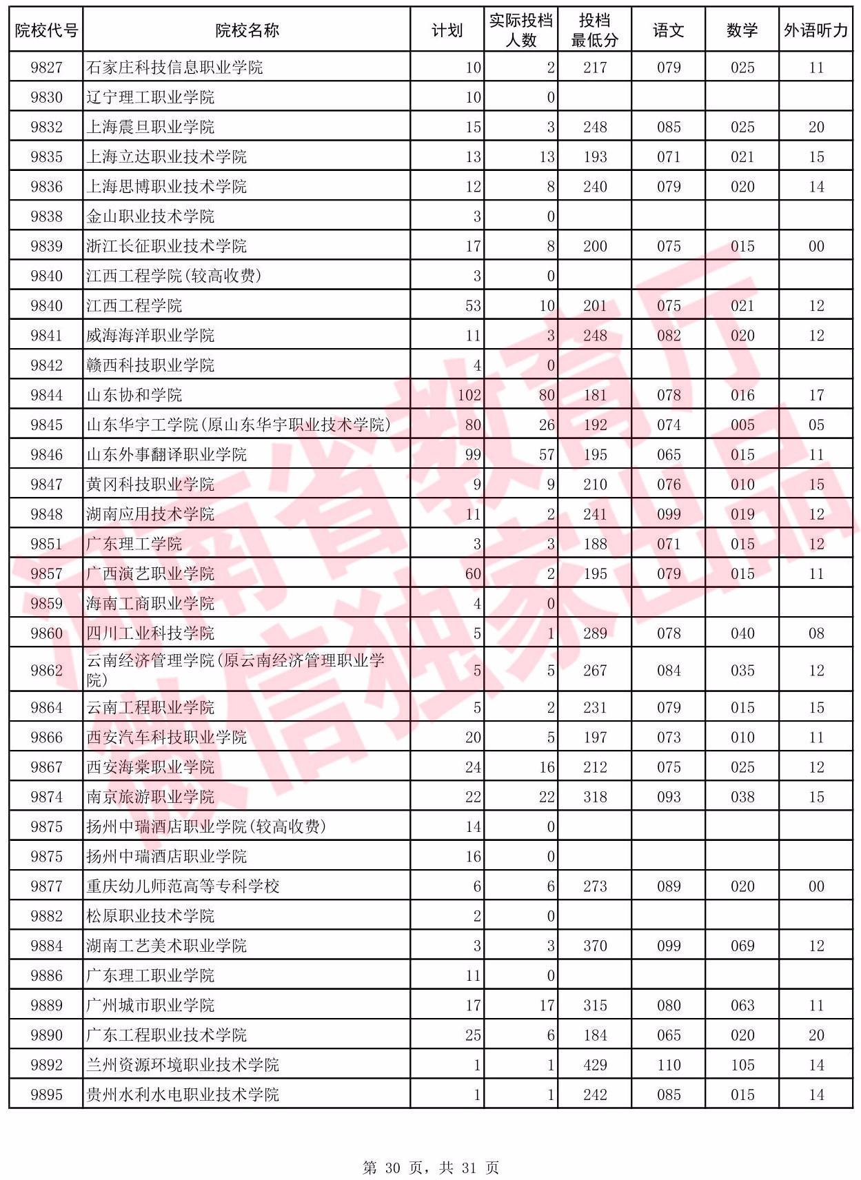 高职高专批院校平行投档分数线(理科)
