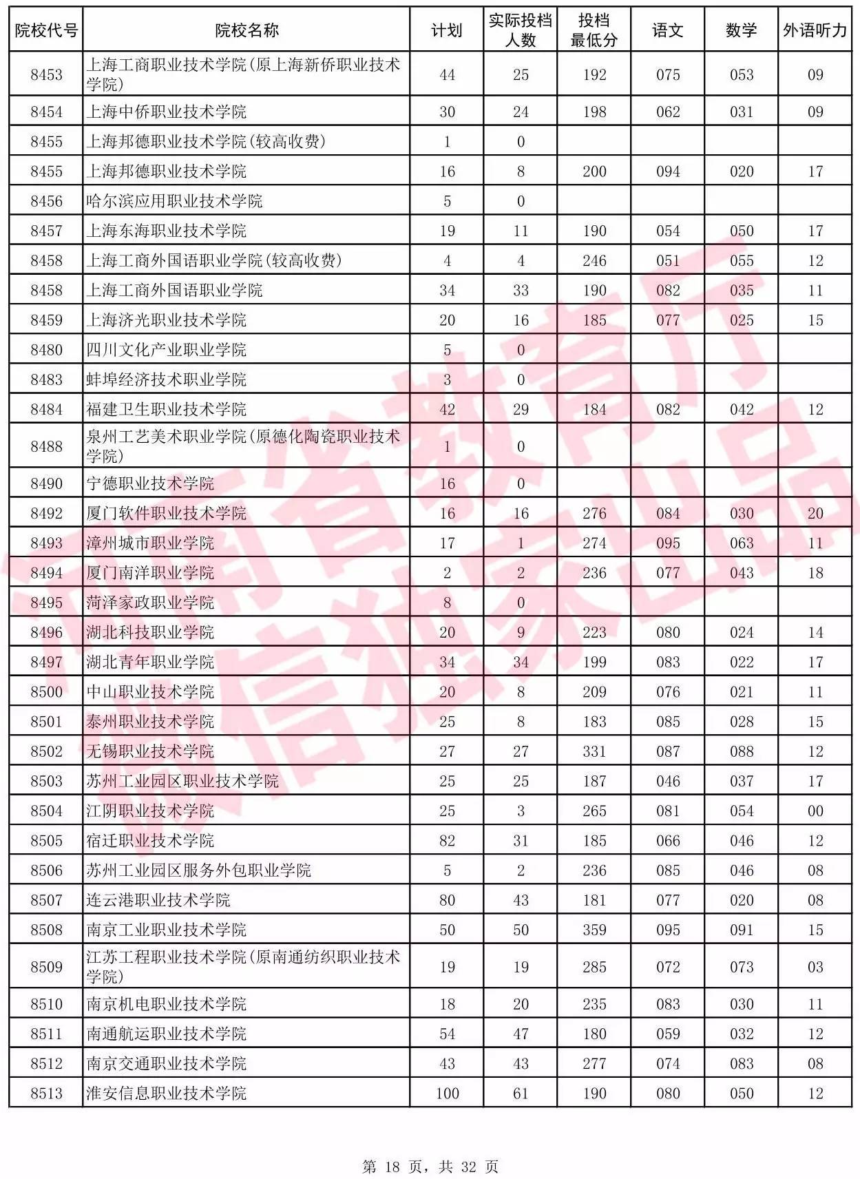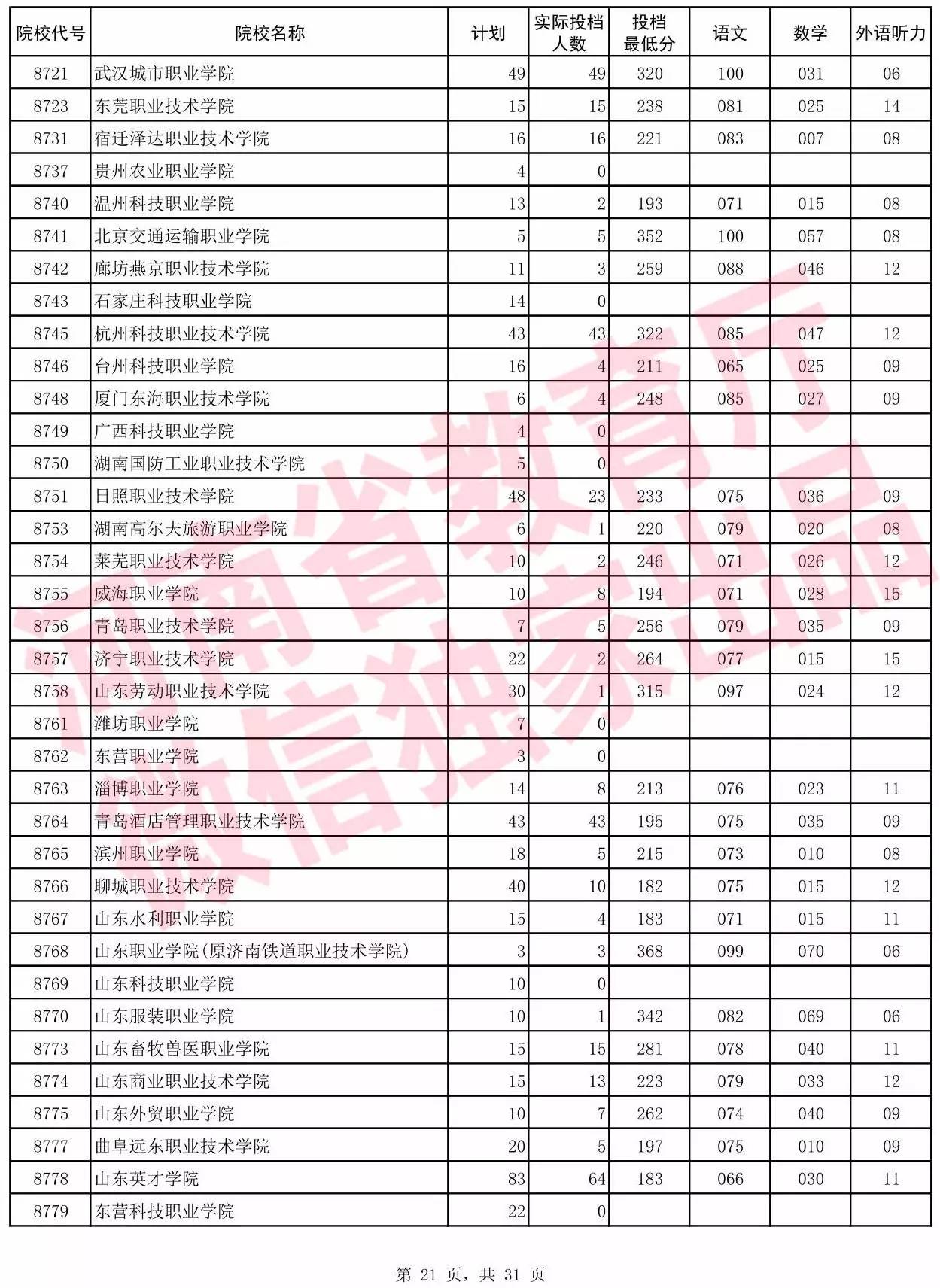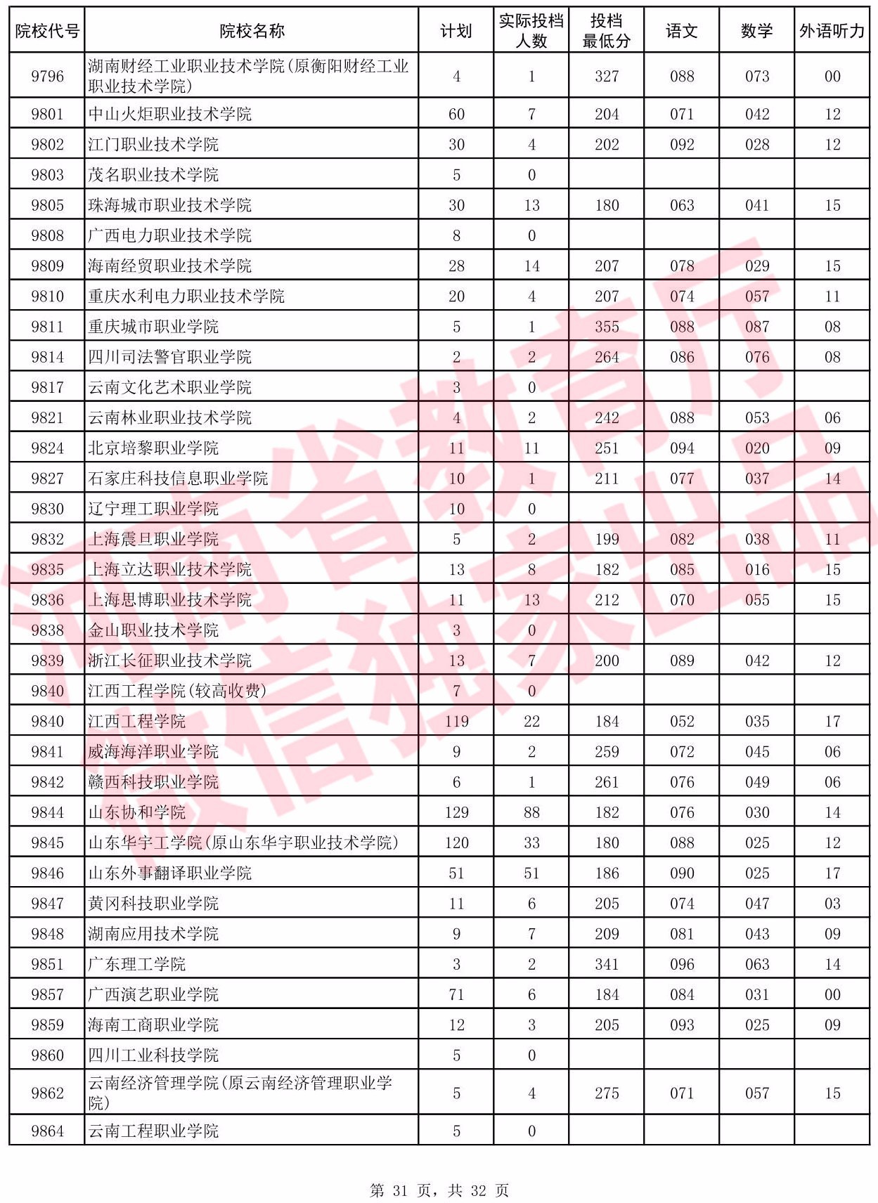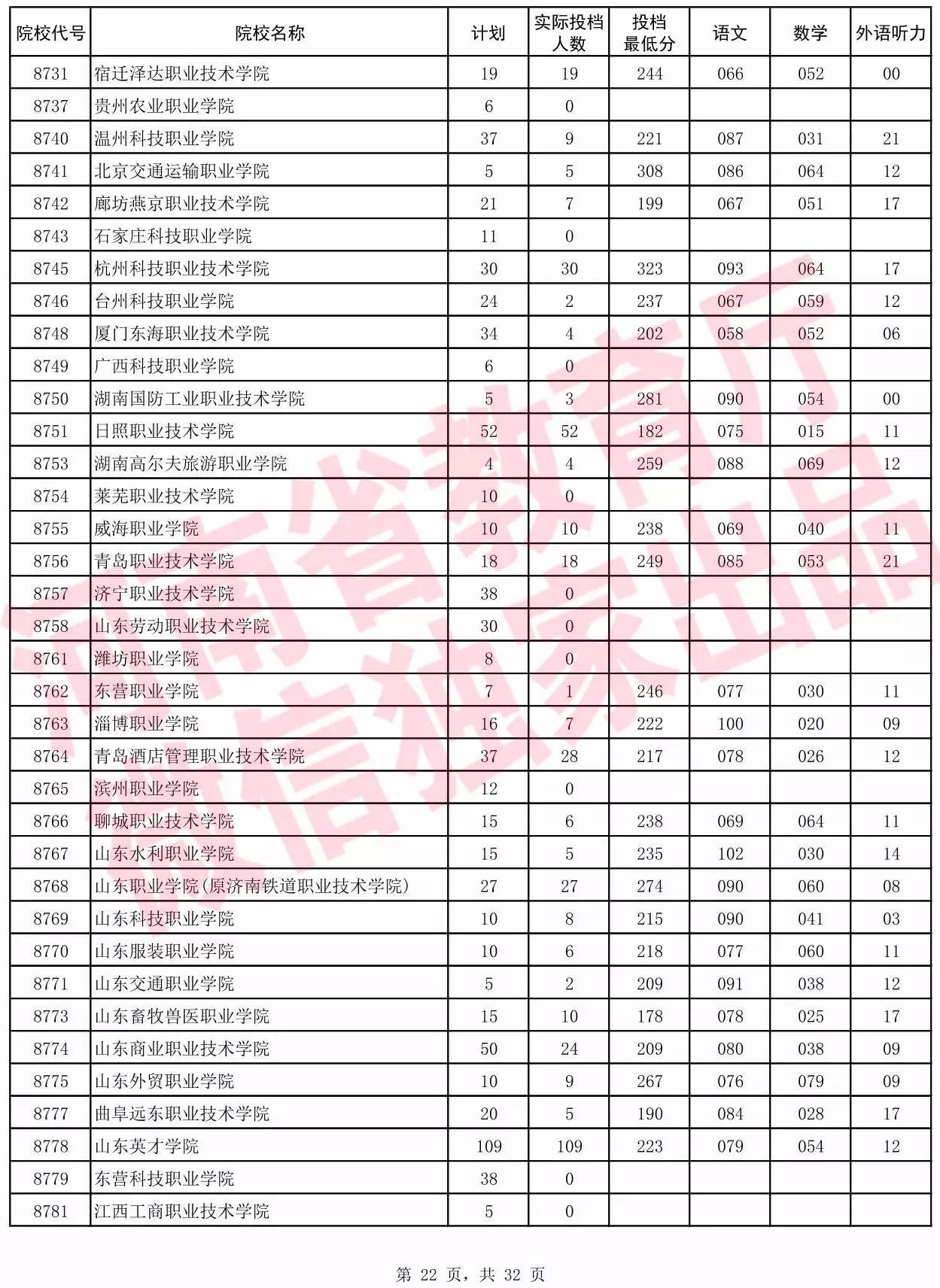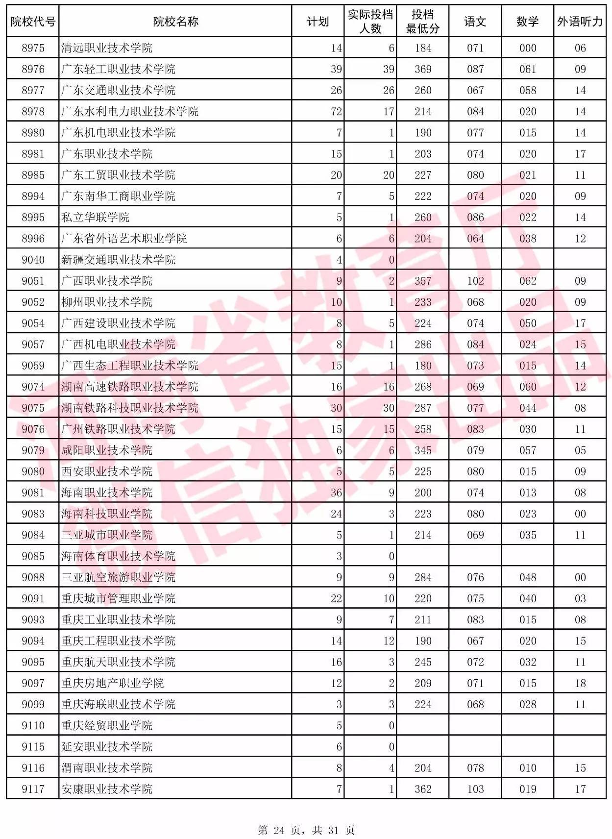 高职高专批院校平行投档分数线(理科)