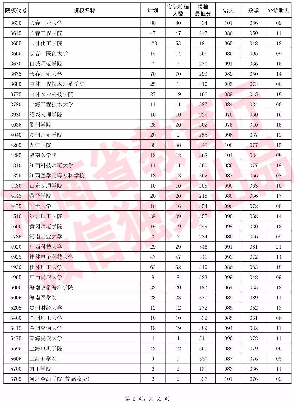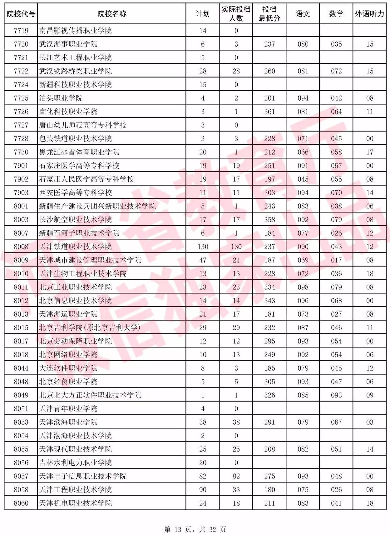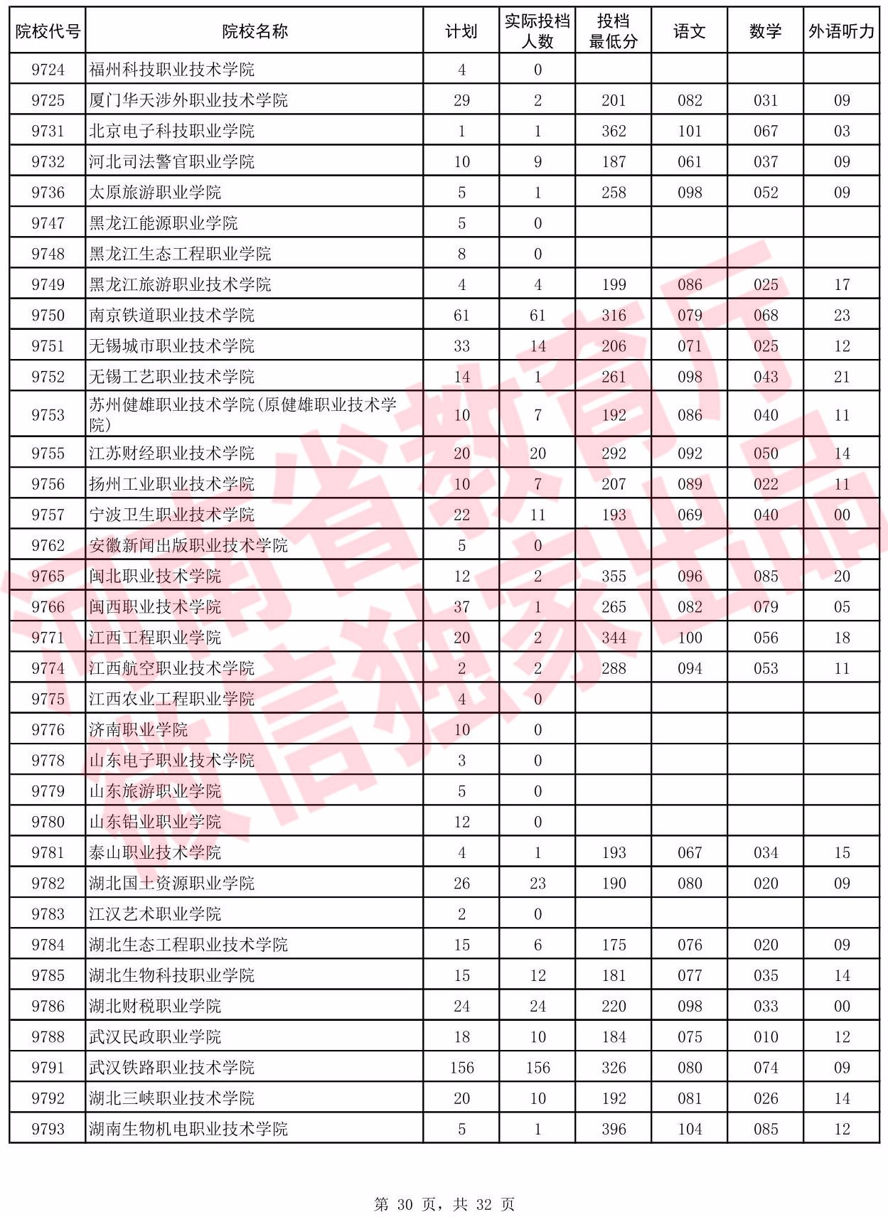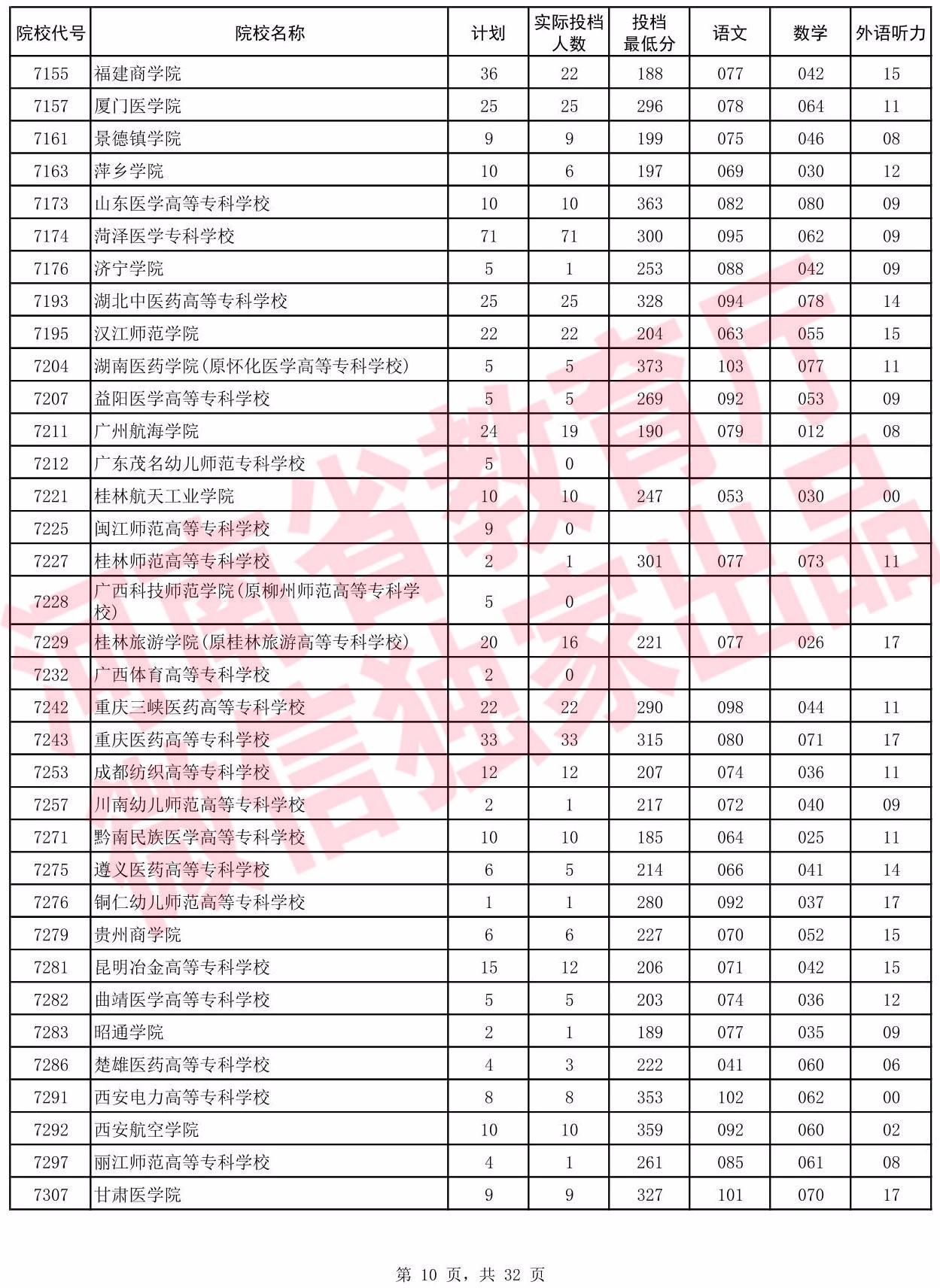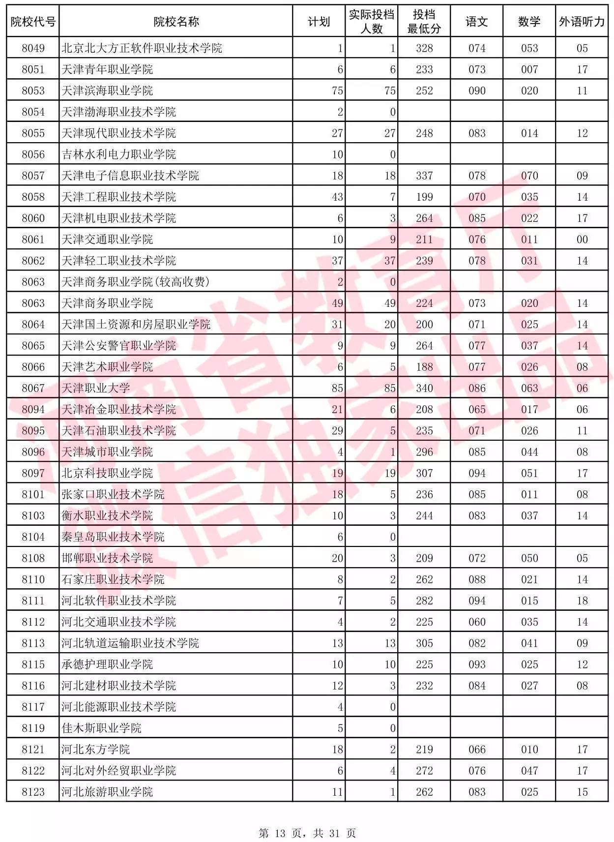 高职高专批院校平行投档分数线(理科)