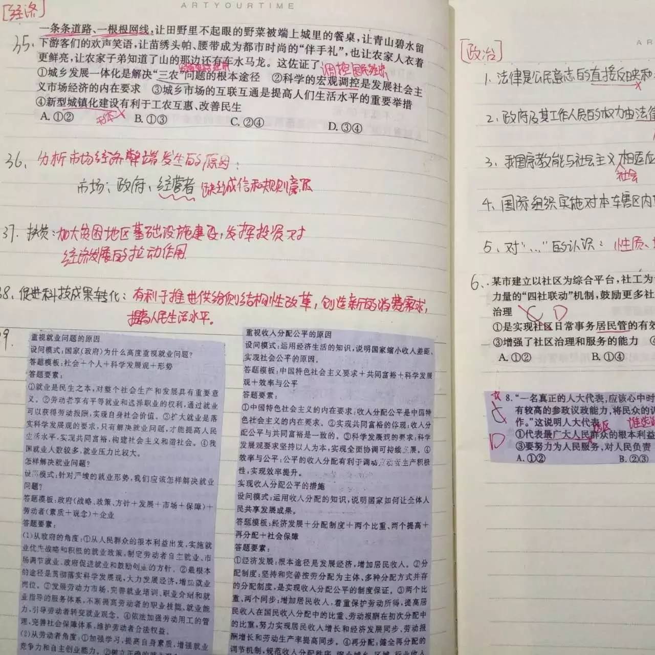 就是每一页上方有写是那本书,我觉得这样比较清晰好看,然后平常老师讲课的一些答题要点或者试卷中一些经典的句子也可以记下来,多看考试就可以答好点啊。然后平常书上看到的一些答题要点也可以剪下来贴上去背背。一些重点的句子之类的用红笔标出更明显。