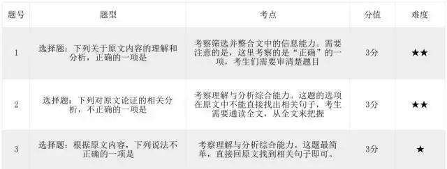 文言文阅读:文言文阅读从出题的来源来看,都是以正史史书为标准,选择人物都是正面人物,精神上都值得有我们值得学习的地方。此外选择人物的时候,也是比较冷门的人物。文言文字数中等,无过难处。出题难度较低。