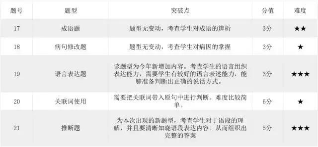 语言文字运用:语言文字运用的题量、考点设置与去年相同,考查成语的辨析、病句、关联词、表述、推断。舍弃图文转换题。