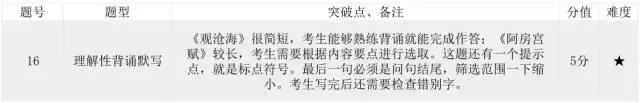 名篇名句默写:全国课标卷名篇名句默写考14篇高中古诗文和50篇初中古诗文,共64篇,而且是考查在语境中的具体运用。本次题目根据横线前后的内容,进行衔接理解性默写。选取的诗文一篇出自初中部分的《观沧海》,一篇出自高中部分的《阿房宫赋》。