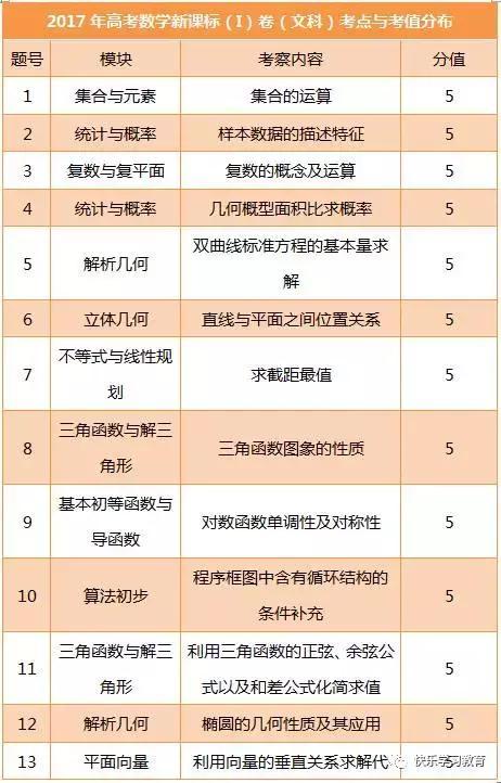 2017高考数学试题的难度不大,文科和理科的数学难度有所下降,试卷结构完全贴合新高考的考纲要求。考察内容方面注重基础的考察,重点突出考察“三角函数”、“数列与不等式”、“立体几何”、“概率统计”、“解析几何”、“函数与导数”,这六大板块依旧是考察的重点,且难度适当,依然体现了“以学生为本”,“在基础中考察能力”的要求。同时文科和理科在命题上面的差异性也逐年减小,加大对知识本身的理解,减小计算的难度。