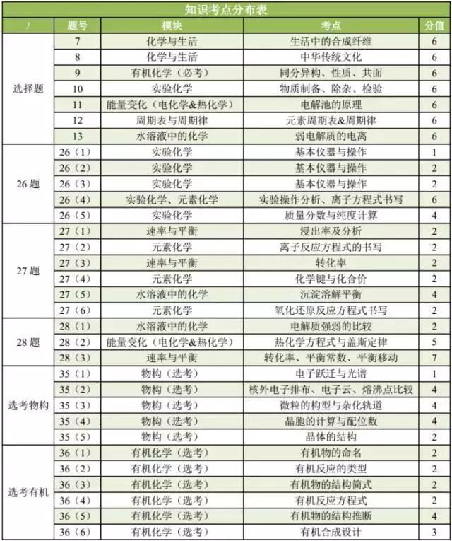 全卷,必考部分涵盖必修模块“必修1”、“必修2”和“选修4-化学反应原理””等内容,选考从“选修3-物质结构与性质”、“选修5-有机化学基础”中二选一,细化各模块的分值分布相对均衡、合理。能全面考察学生高中化学的综合学习情况。知识考点分布表