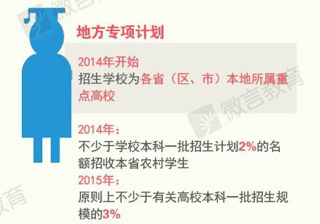 地方专项计划由各省(区、市)本地所属重点高校承担,招生计划原则上不少于有关高校本科一批招生规模的3%。地方专项计划实施区域、报考条件和录取办法由各省(区、市)因地制宜确定。