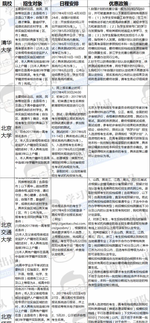 下面列举2017年17所高校专项计划的招生简章,大家可以做一个初步了解: