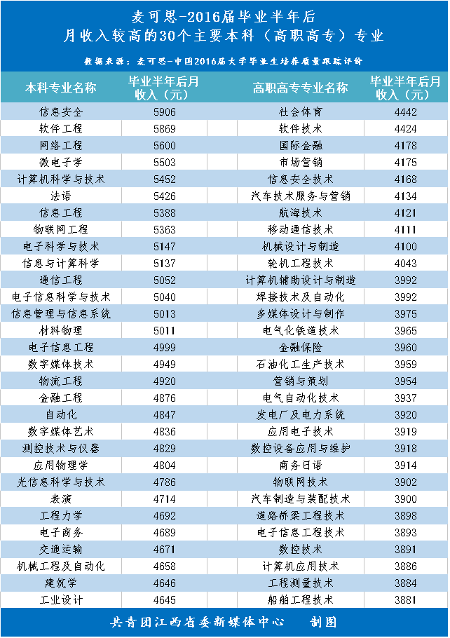 麦可思研究院公布了《2016届毕业半年后月收入较高的50个主要本科专业》。2017年大学生就业蓝皮书数据显示:本科方面,2016届毕业半年后月收入较高的专业是信息安全(5906元),其次是软件工程(5869元)。