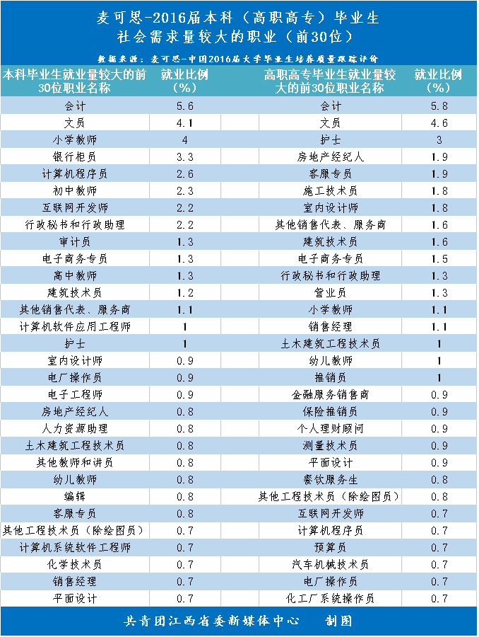 什么职业时下社会需求量较大?2017年就业蓝皮书数据显示:2016届本科毕业生社会需求量较大的职业前两名都是会计和文员。会计就业比例为5.6%,文员为4.1%。