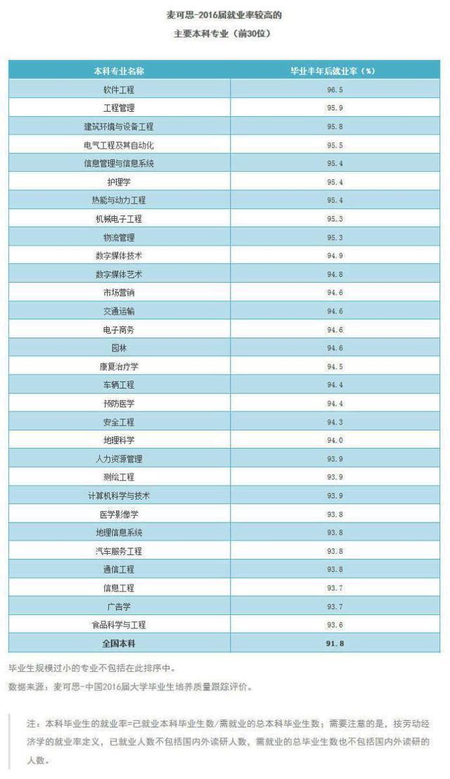 在麦可思先前统计的2016届就业率最高的本科专业排名中,材料科学与工程、化学与生物学均未上榜。就业率排名第一的软件工程在名单中共进入五所院校的一流学科名单,分别是北京大学、清华大学、北京航空航天大学、浙江大学、国防科技大学。