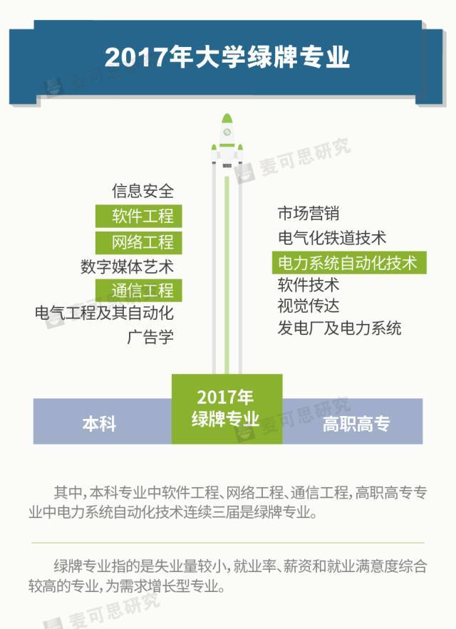 2017年本科就业绿牌专业包括:信息安全、软件工程、网络工程、数字媒体艺术、通信工程、电气工程及其自动化、广告学。其中,软件工程、网络工程、通信工程连续三届是绿牌专业。