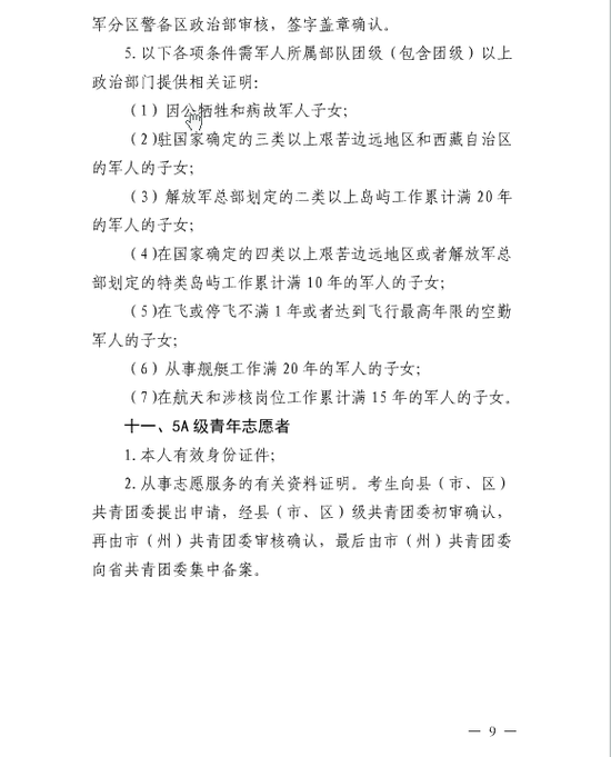 3。平时荣获二等功或者战时荣获三等功以上奖励的军人的子女,一至四级残疾军人的子女,因公牺牲军人的子女,驻国家确定的三类以上艰苦边远地区和西藏自治区,解放军总部划定的二类以上岛屿工作累计满20年的军人的子女,在国家确定的四类以上艰苦边远地区或者解放军总部划定的特类岛屿工作累计满10年的军人的子女,在飞或停飞不满1年或达到飞行最高年限的空勤军人的子女,从事舰艇工作满20年的军人的子女,在航天和涉核岗位工作累计满15年的军人的子女,参加高考并达到有关高等学校投档线的,由院校决定是否予以优先录取。