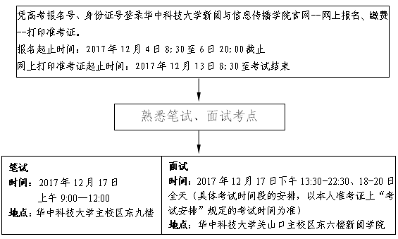 4.打印准考证:考生报名成功后,于2017年12月13日8:30至考试结束,登录华中科技大学新闻与信息传播学院官网,自行下载打印准考证。