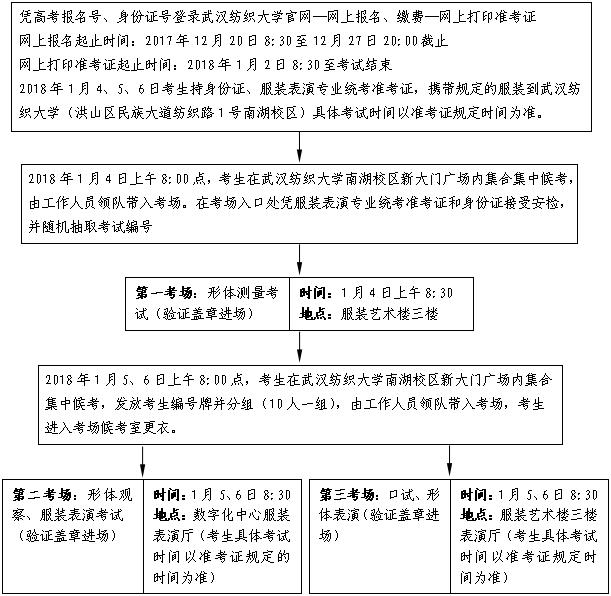 取得艺术类高考报名号并完成高考报名的考生,于2017年12月20-27日(12月20日8:30开始,12月27日20:00截止),凭高考报名号及身份证号登录武汉纺织大学官网(网址www.wtu.edu.cn),进行专业统考报名,填报相关信息并完成网上缴费。网报结束后,系统将自动关闭,未在规定时间内完成网上报名或网上缴费的,视为未报名,不予安排考试。