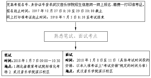 5.打印准考证:考生报名成功后,于2018年1月5日至考试结束,登录武汉音乐学院招生信息网自行下载打印准考证。