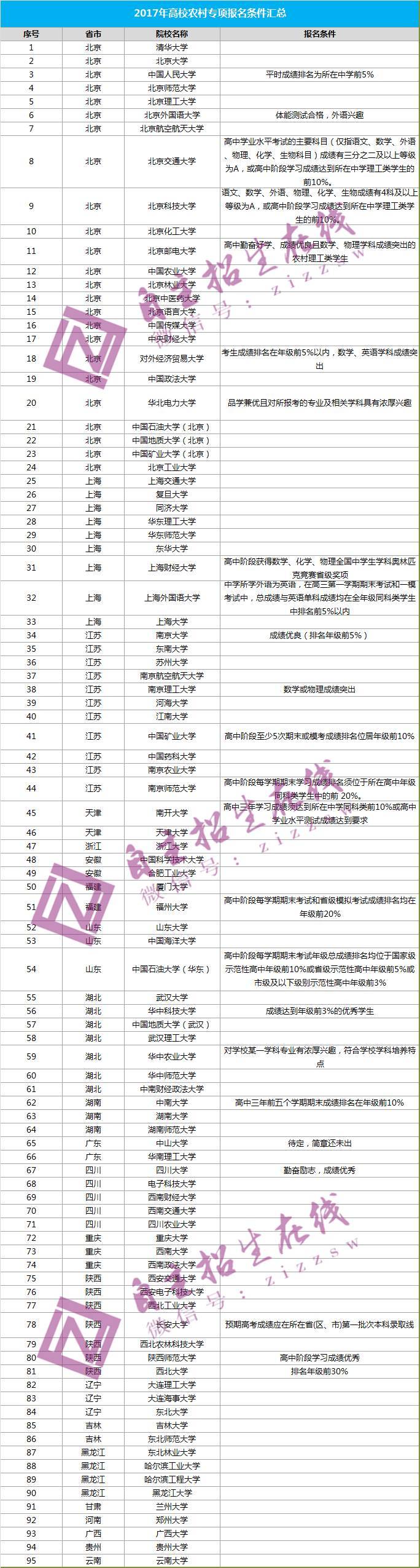 以上招生要求是根据2017年高校专项招生条件综合而制,2018年招生条件以高校最终公布为准。此外,有一部分学校在这三个基本条件上额外增加了一些条件,只有满足这些条件的考生才有报名资格,只有满足这些条件的考生才有报名资格,具体如下。
