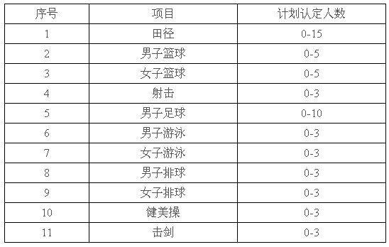 高水平运动队招生计划严格按照教育部的有关规定执行,各项目计划认定并公示的人数为:
