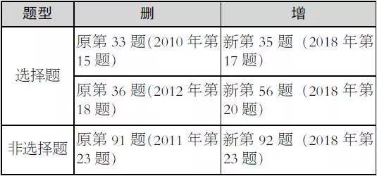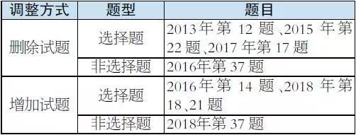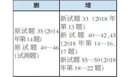 新版《考试说明》在整体稳定的基础上,针对部分内容进行调整,具体情况如下:“试卷结构”与“考试内容及要求”均无变化。“参考样题”部分有略微调整,删去2016年第5、6题和第36题,将2018年第5、8题和第36题纳入其中。“参考样题”调整情况如下: