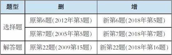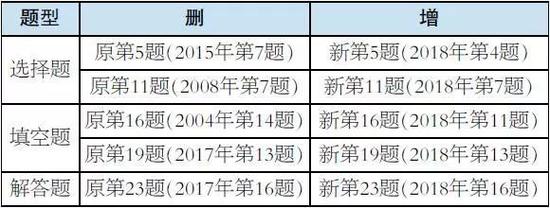 新版《考试说明》中,“试卷结构”“考试内容及要求”保持不变。“参考样题”略有调整,删去个别往年旧题,将2018年高考数学(北京卷)部分试题纳入其中。具体调整如下: