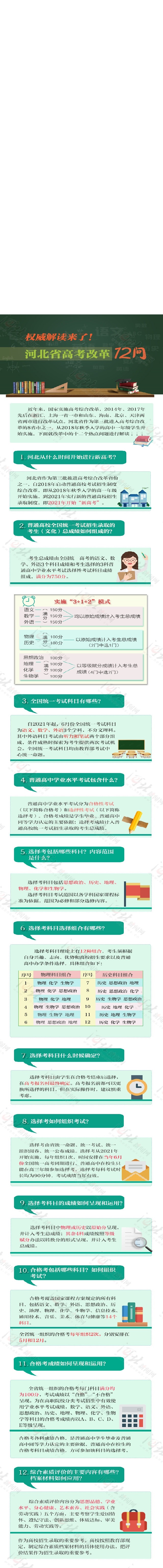 近年来,国家实施高考综合改革,2014年、2017年先后在浙江、上海一省一市和山东、海南、北京、天津两省两市进行改革试点。河北省作为第三批进入高考综合改革的8省市之一,从2018年秋季入学的高中一年级学生开始实施。下面就改革中的十二个热点问题进行解读。